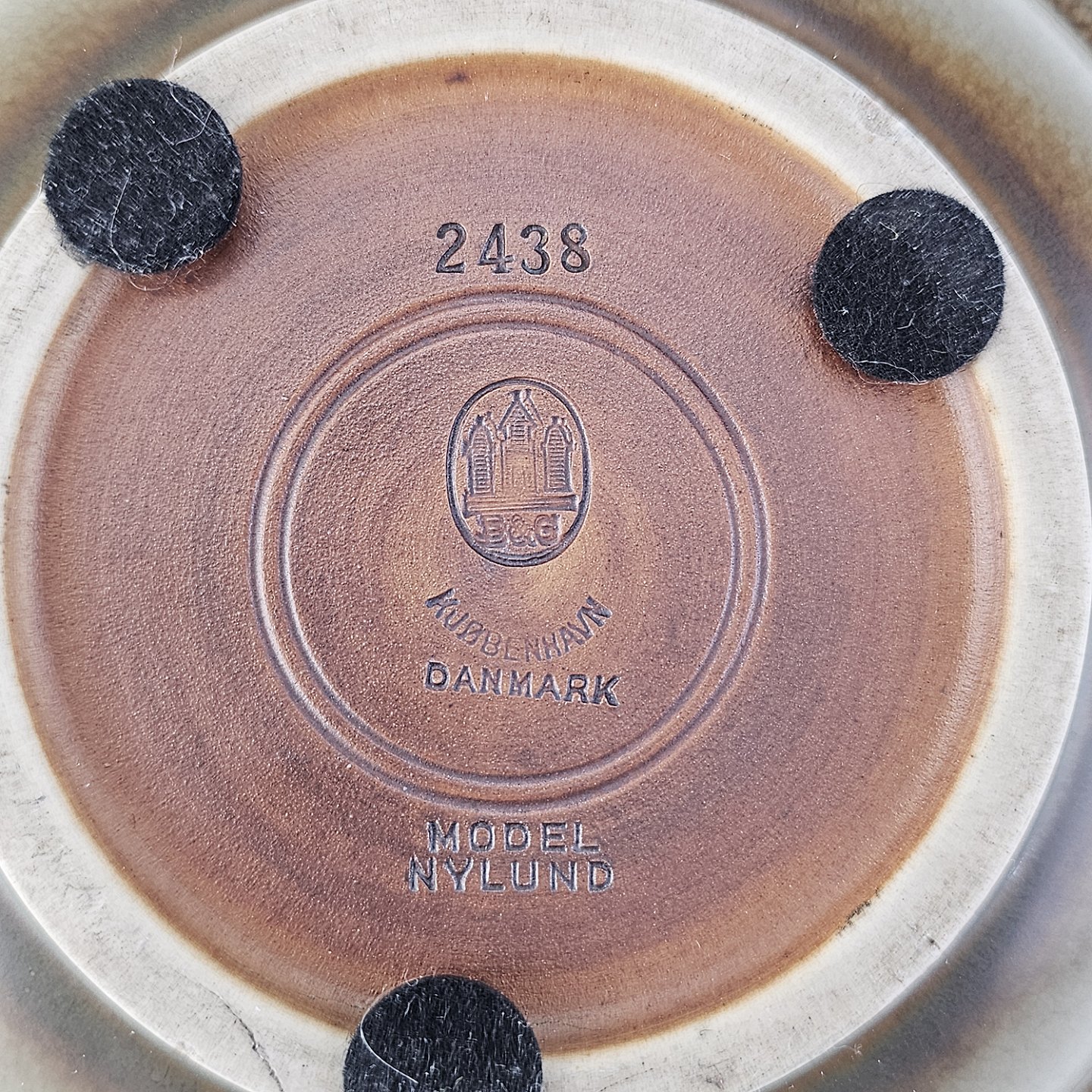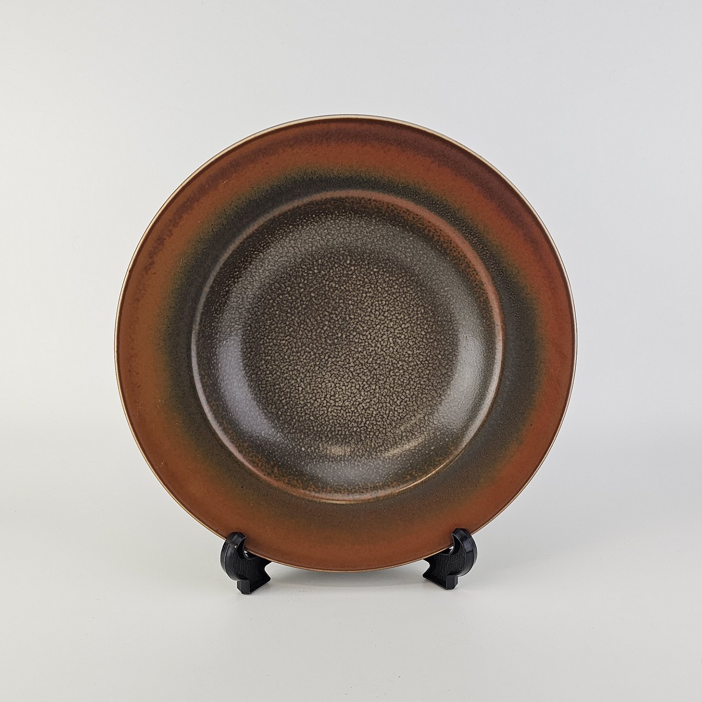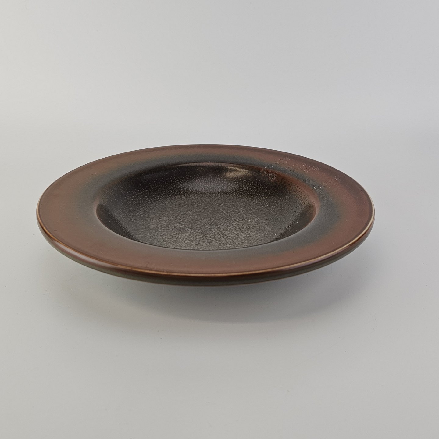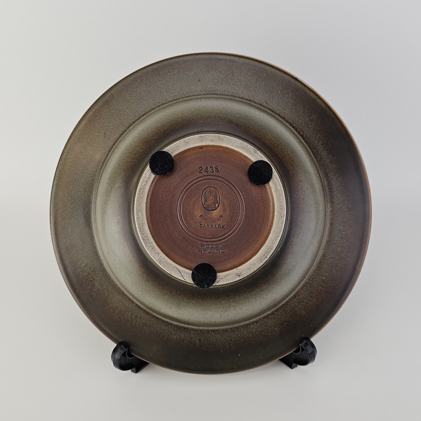 Beskrivelse: Rundt fad i stentøj med brun glasur. Nr. 2738, Model Nylund