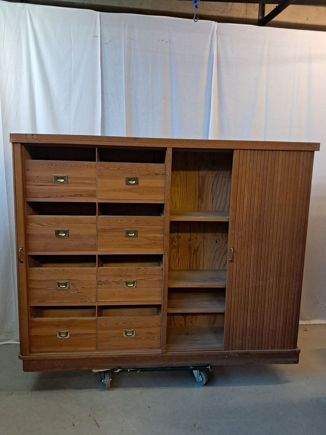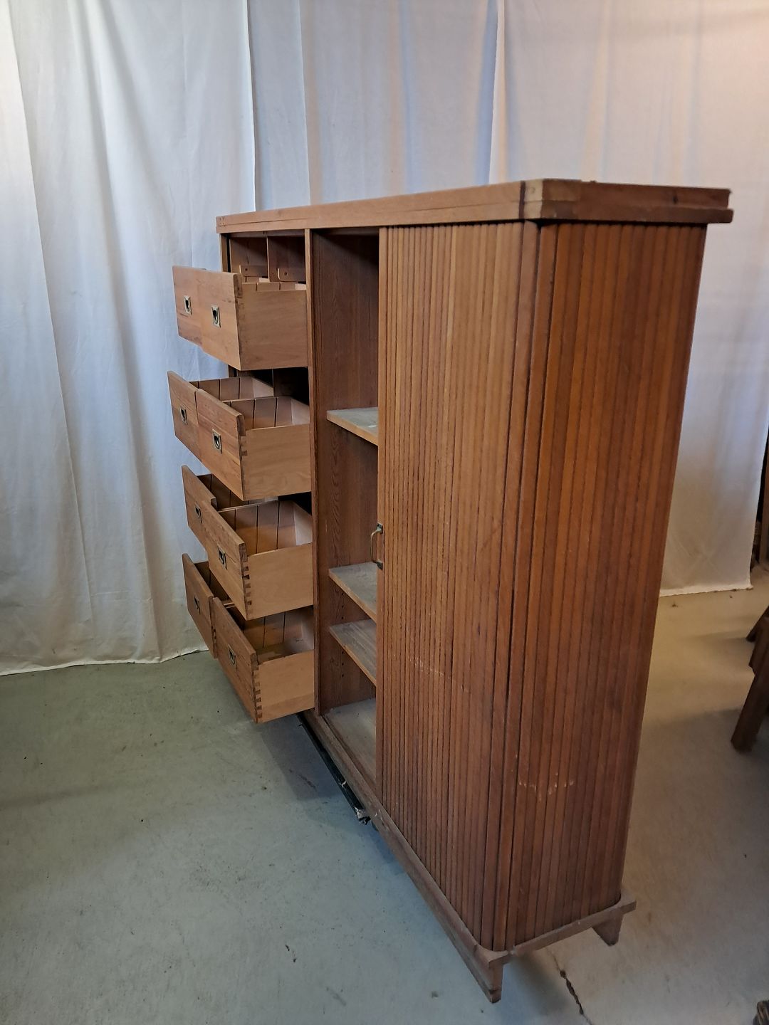 Beskrivelse: Jalousiskab i fineret egetræ, fra 1950erne.