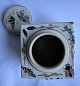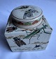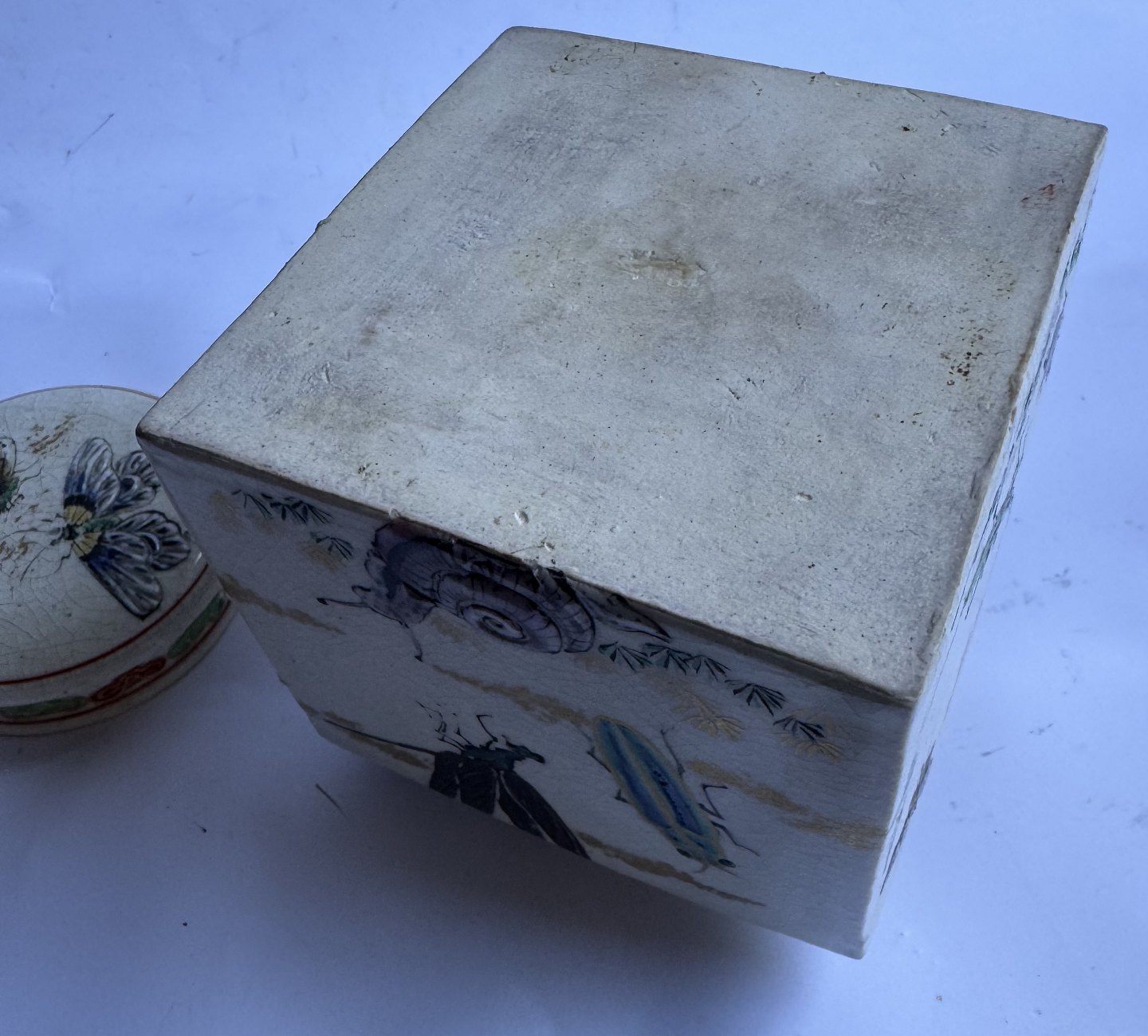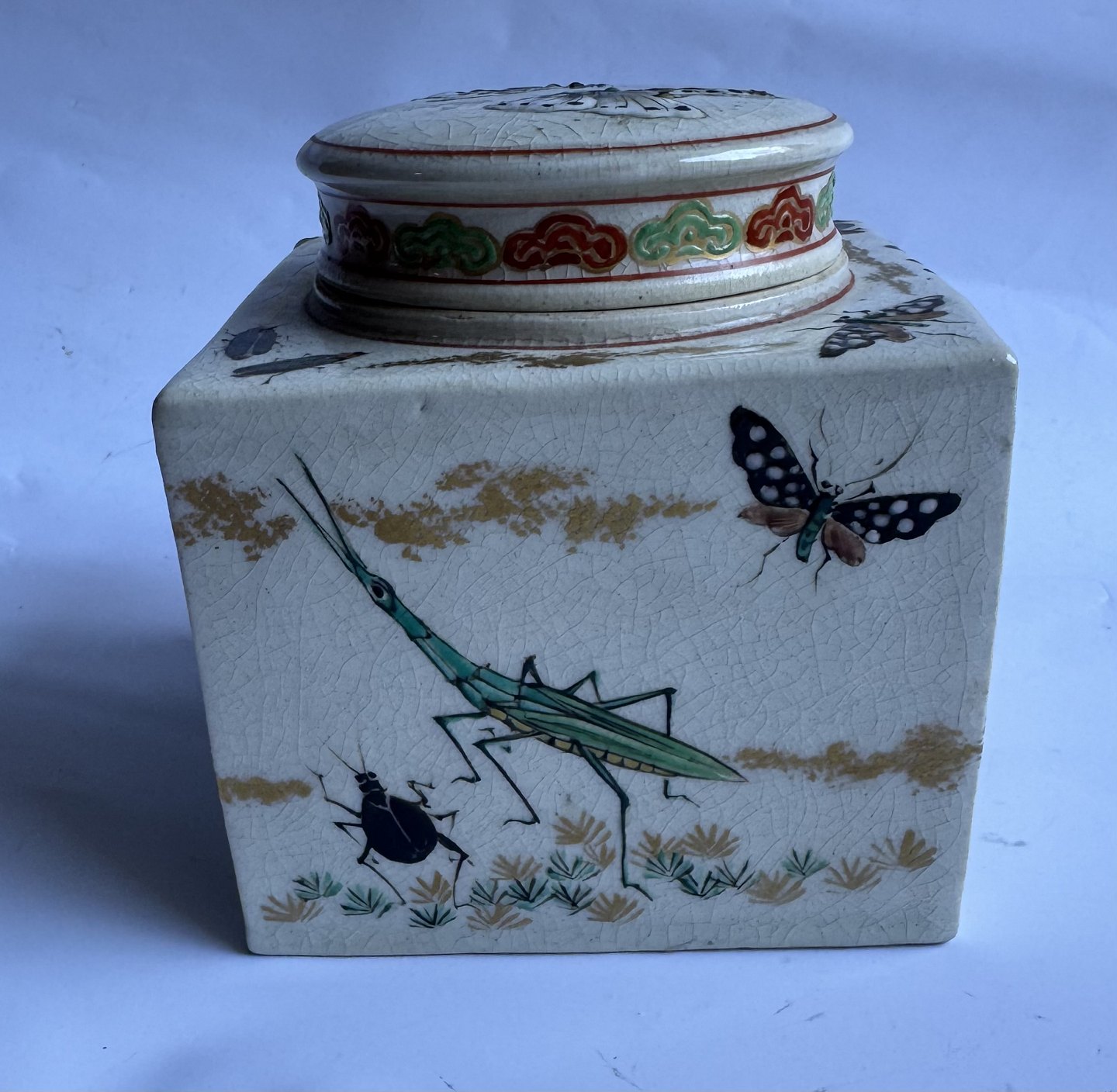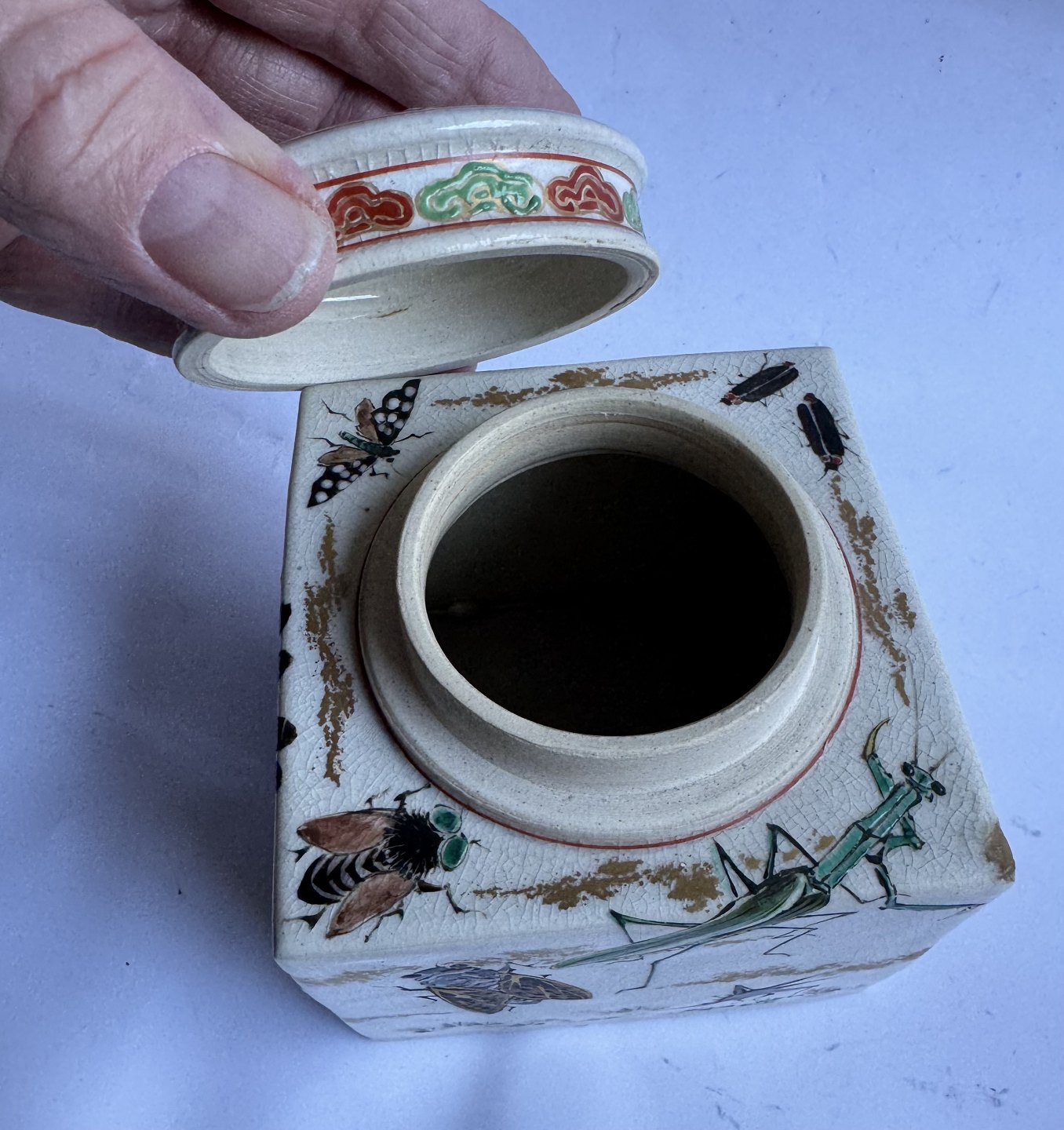 Description: Square tea caddy in faience from Japan produced around 1910. Beautifully decorated with insects on all sides and on the lid. Unknown factory mark stamped on the bottom. Apart from a small scratch on a corner (follow the grey arrows) there is nothing to note. Dimensions: H. 10.7 cm and 9.5 x 9.5 cm.