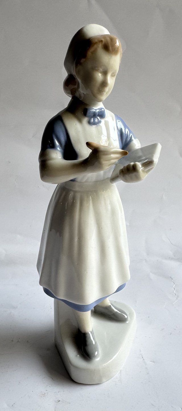 Beskrivelse: Figur af kvindelig sygeplejerske i porcelæn. I god stand uden skader eller reparationer. Fabriksmærket på bunden. H. 19,7 cm