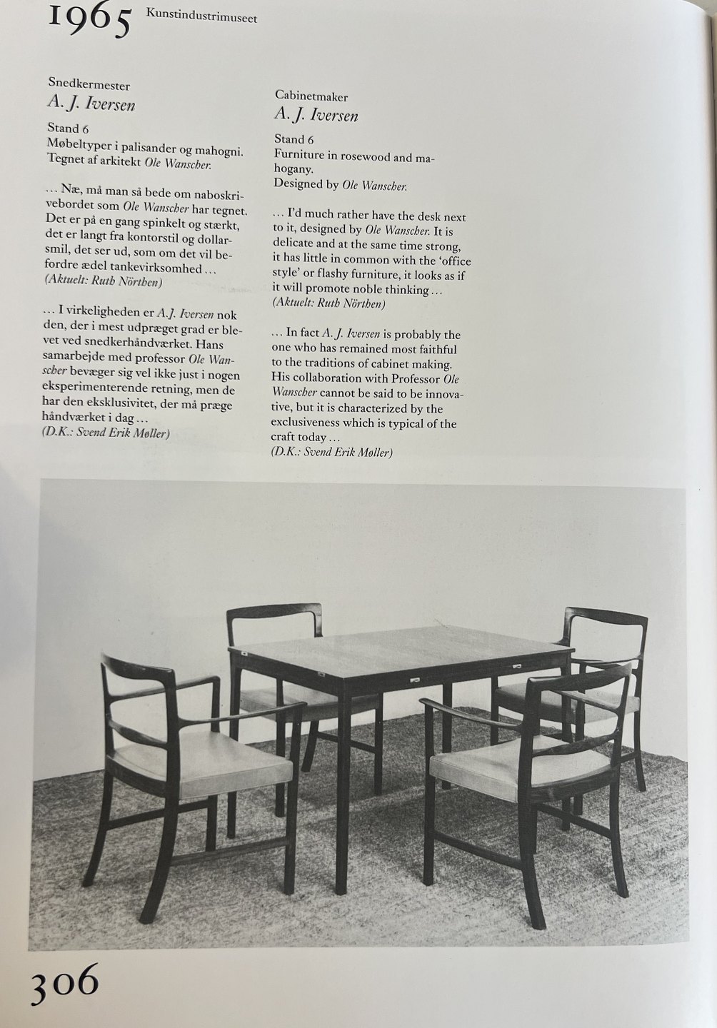 ".....Næ, må man så bede om naboskrivebordet som Ole Wanscher har tegnet. Det er på en gang spinkelt og stærkt, det er langt fra kontorstil og dollarsmil, det ser ud, som om det vil befordre ædel tankevirksomhed". (Aktuelt: Ruth Nörthen)