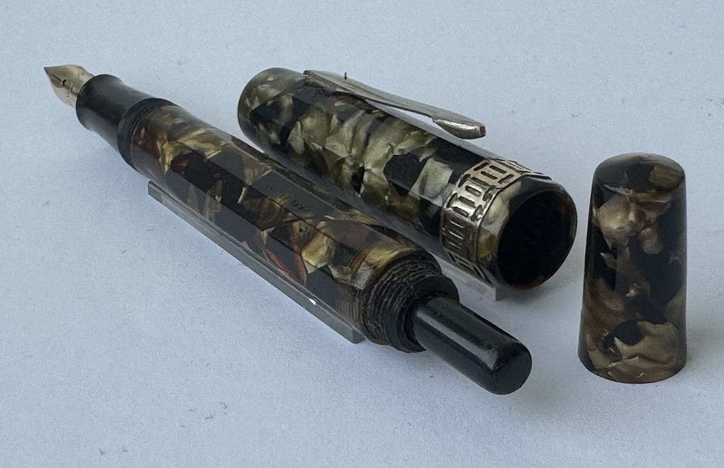 Beskrivelse: REN ART DECO STIL: 10 kantet og grøn marmoreret Miller nr. 697 fyldepen fra omkring 1940. I god stand uden skader eller reparationer. Alle dele originale til denne model inklusive en 14 karats guldspids (ca. 0,30 gram). Ny gummisæk skal indsættes før den igen kan optage blæk og skrive påny. Ny gummisæk kan indsættes for et tillæg på kr. 250,00. Fyldepennen er 12,3 cm lang.