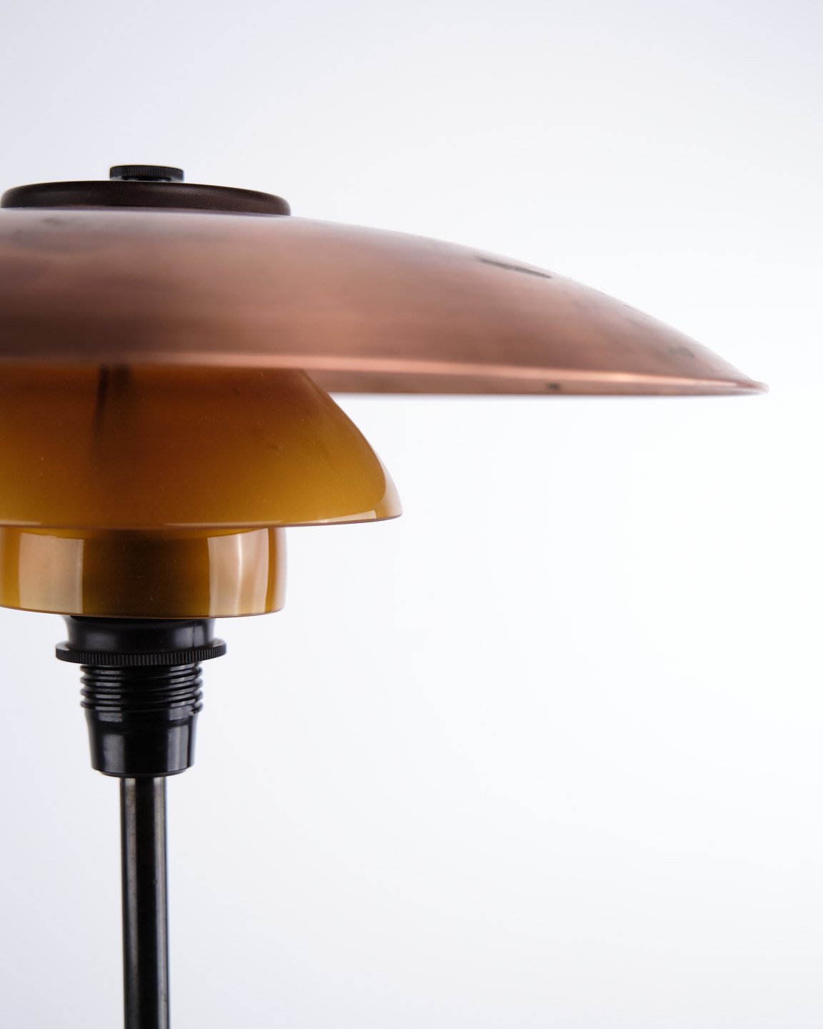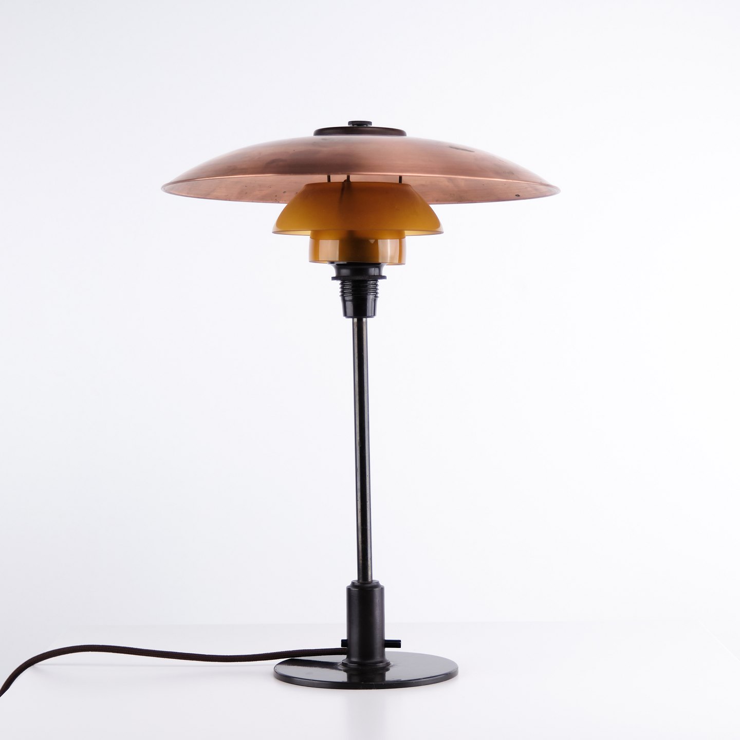 Poul Henningsen Bordlampe Model PH 3,5/2 i Kobber med Ravfarvede Skærme og Fod i Bruneret Messing, Louis Poulsen 1930erne