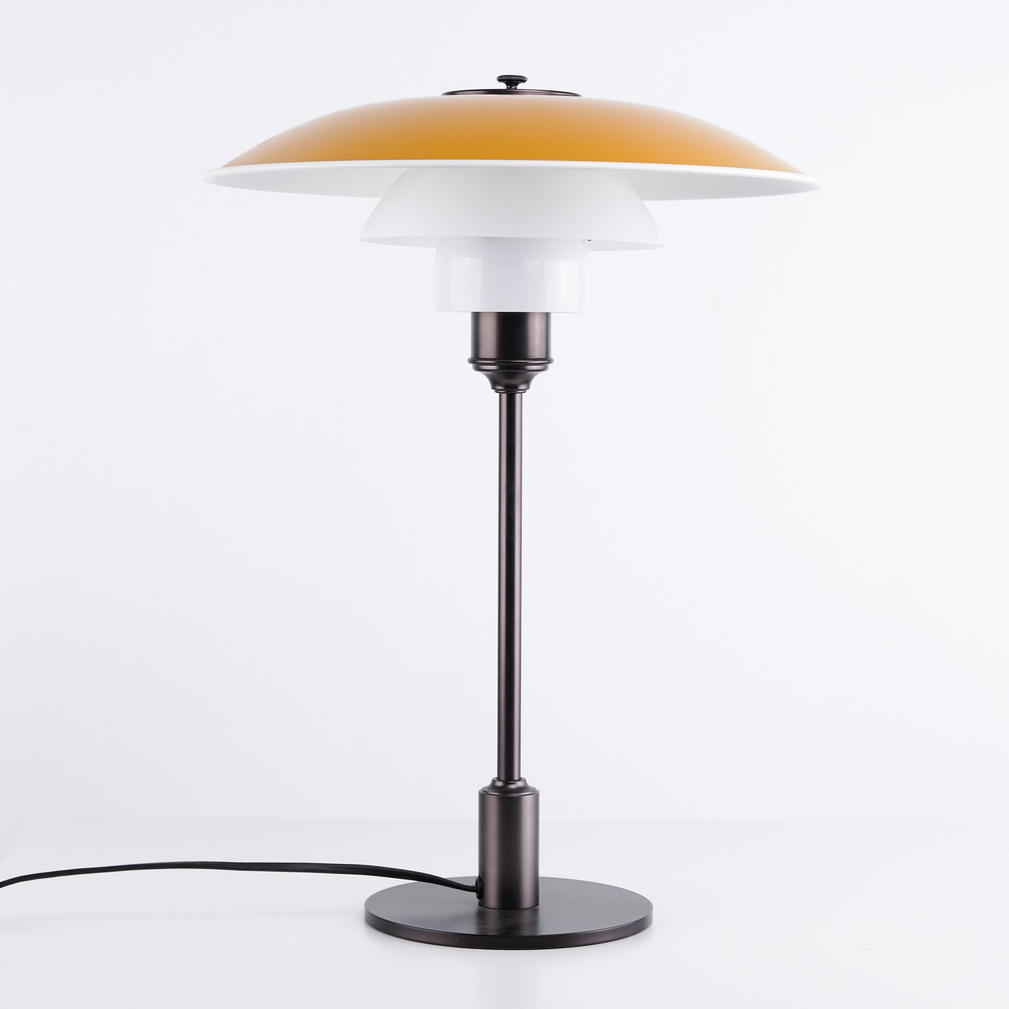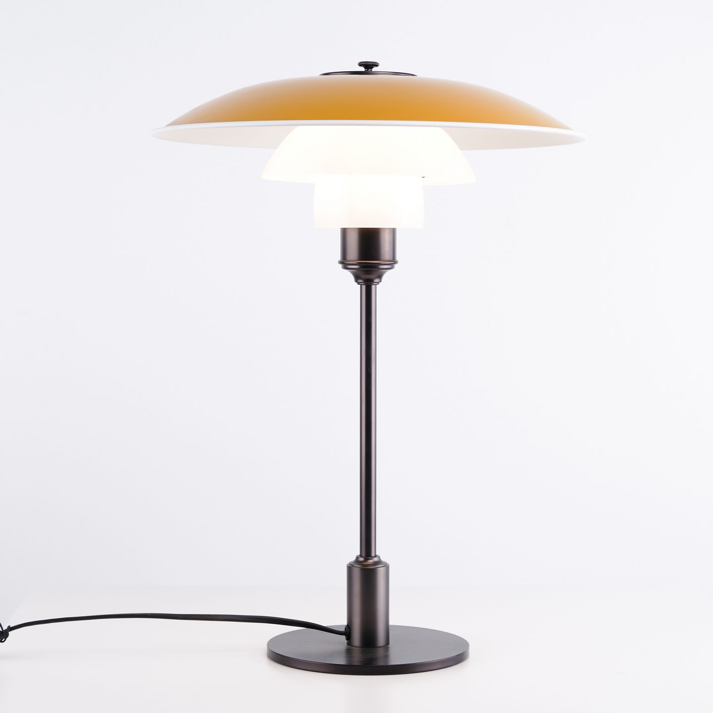 Beskrivelse: PH 3½-2½ bordlampe fra Louis Poulsen designet af Poul Henningsen i gul metal og bruneret messing. Klassisk dansk belysningsdesign.