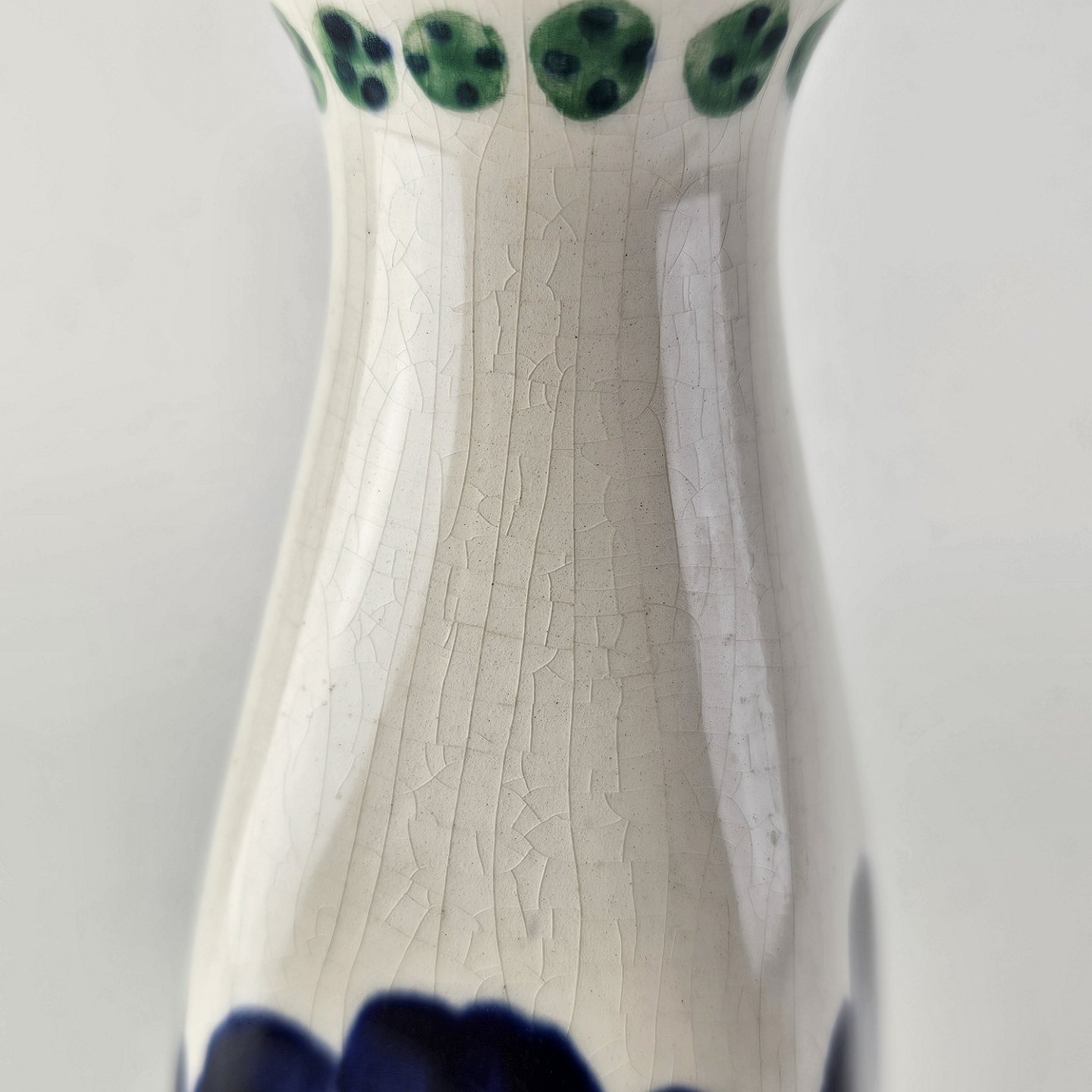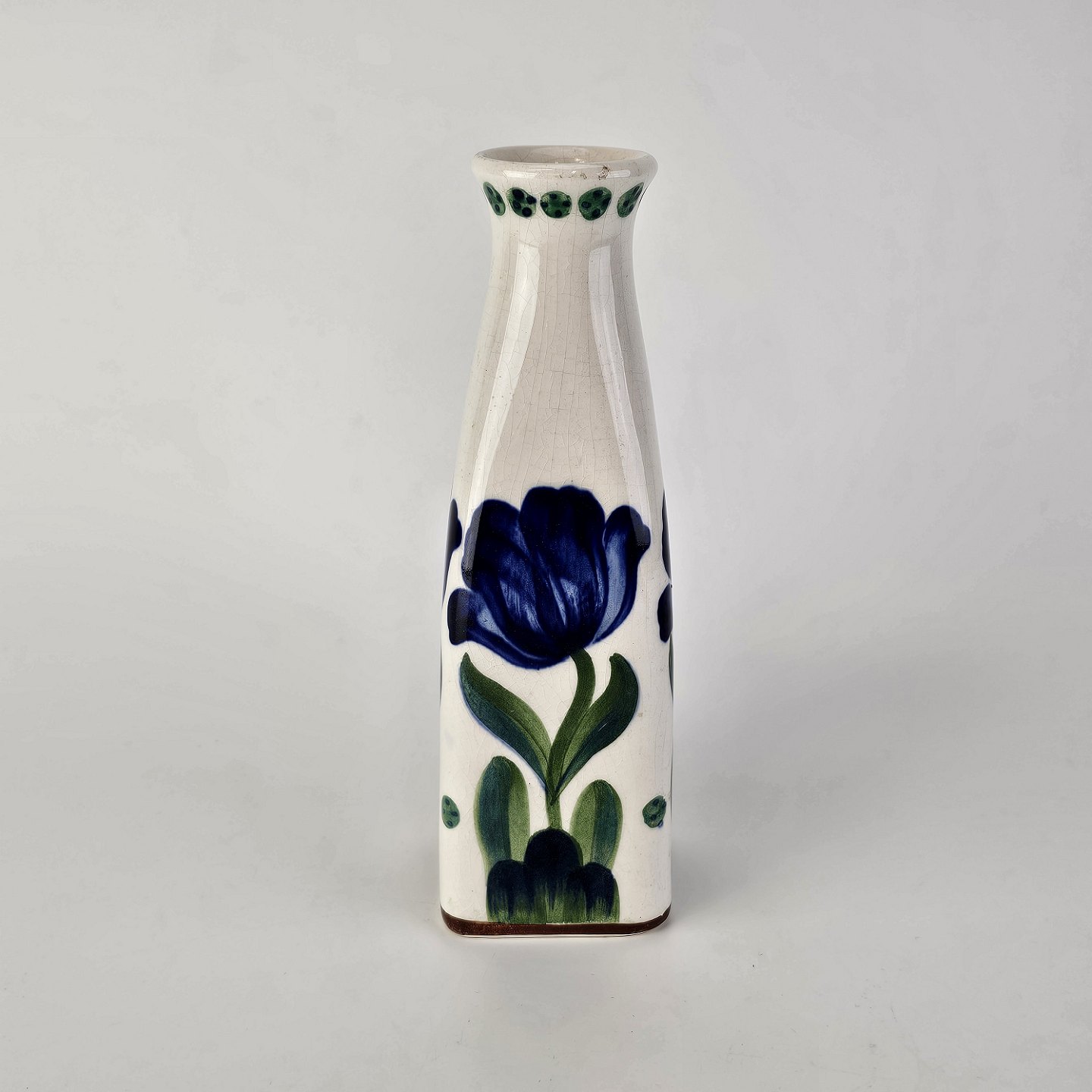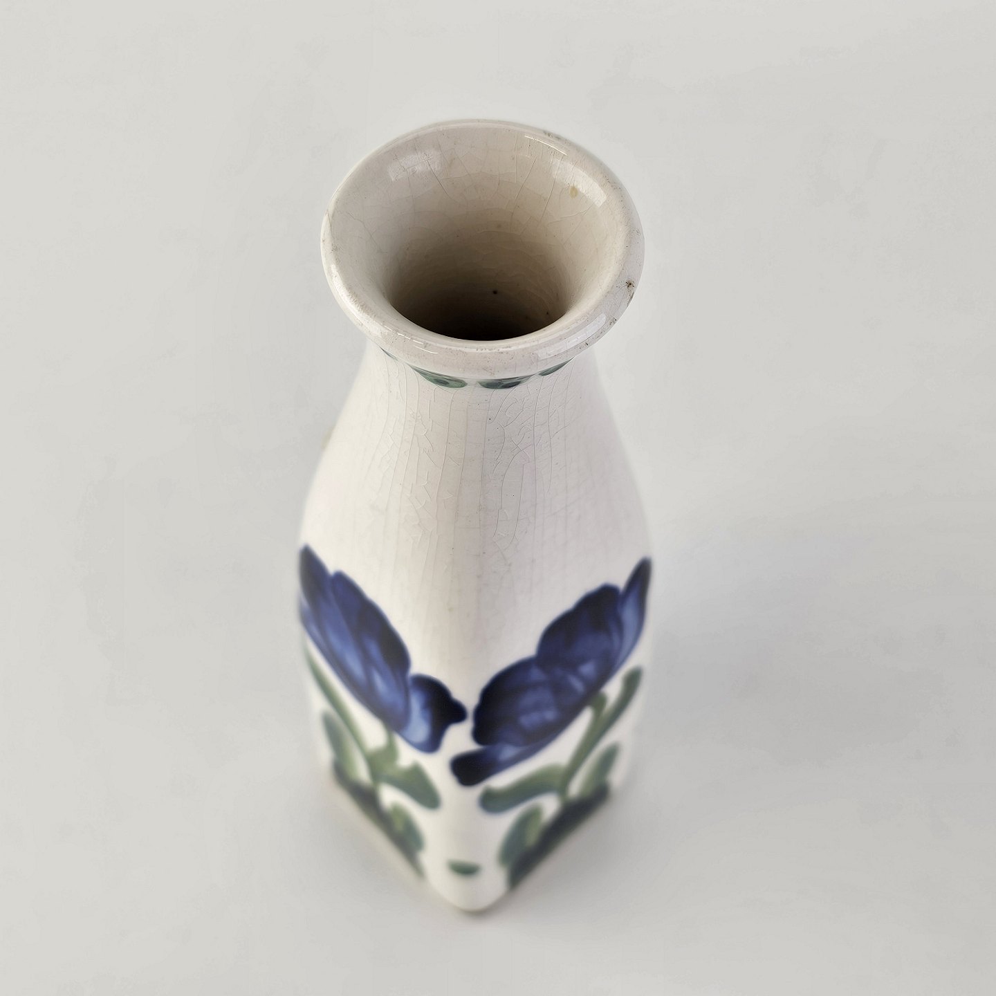 Beskrivelse: Vase i hvid fajance dekoreret med håndmalede blå violer