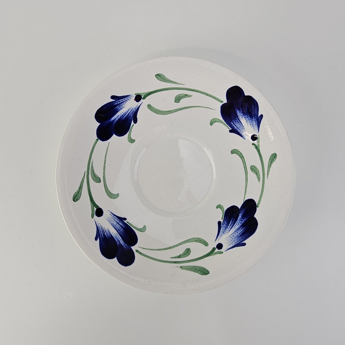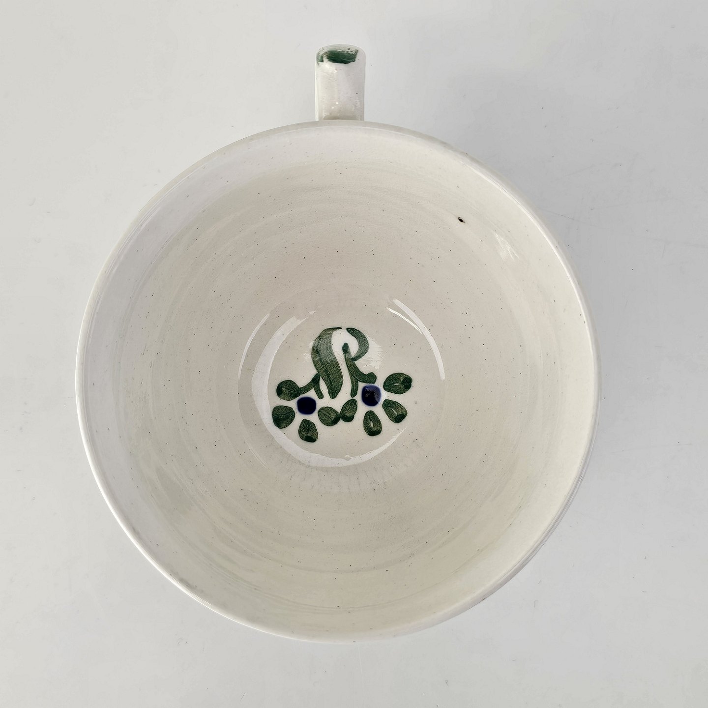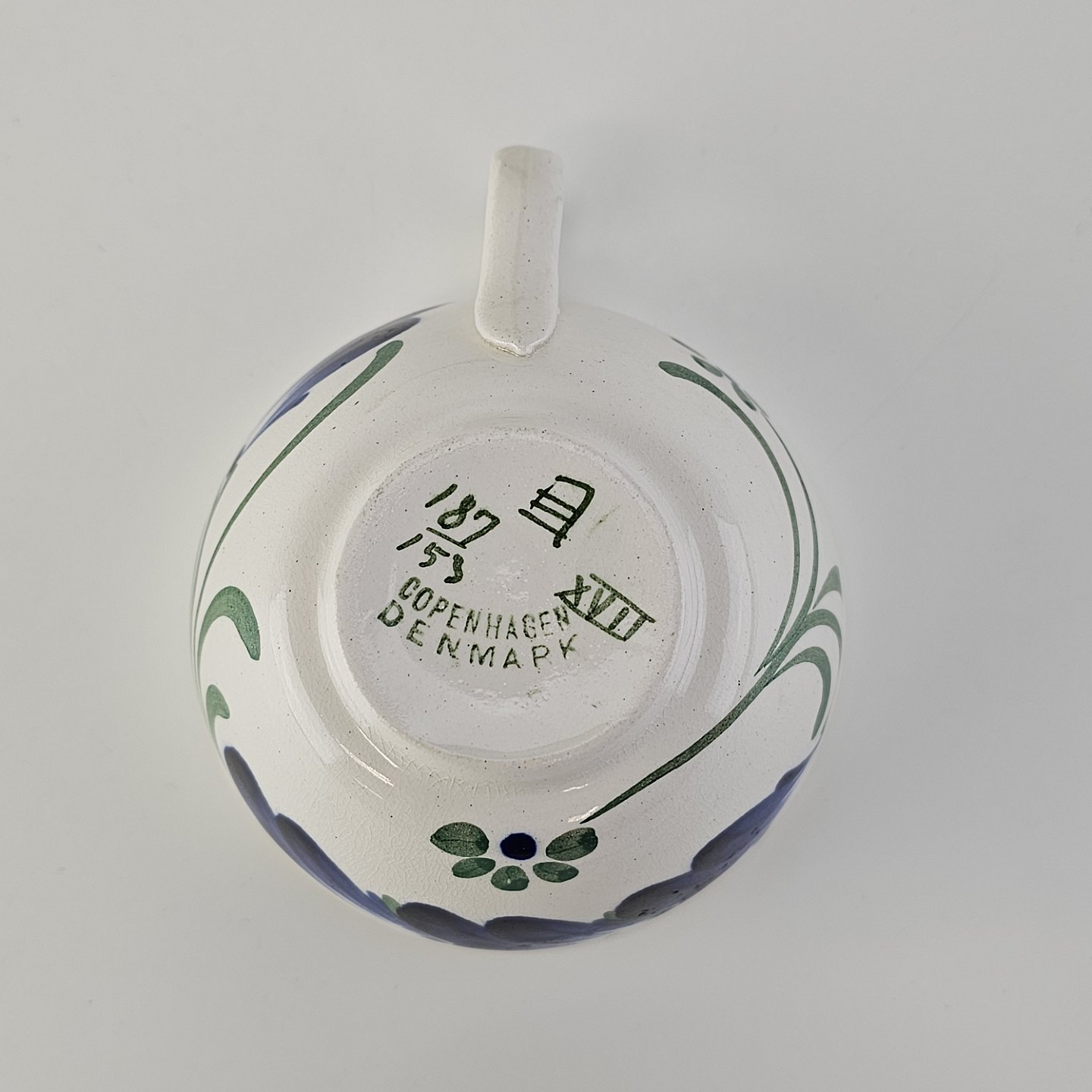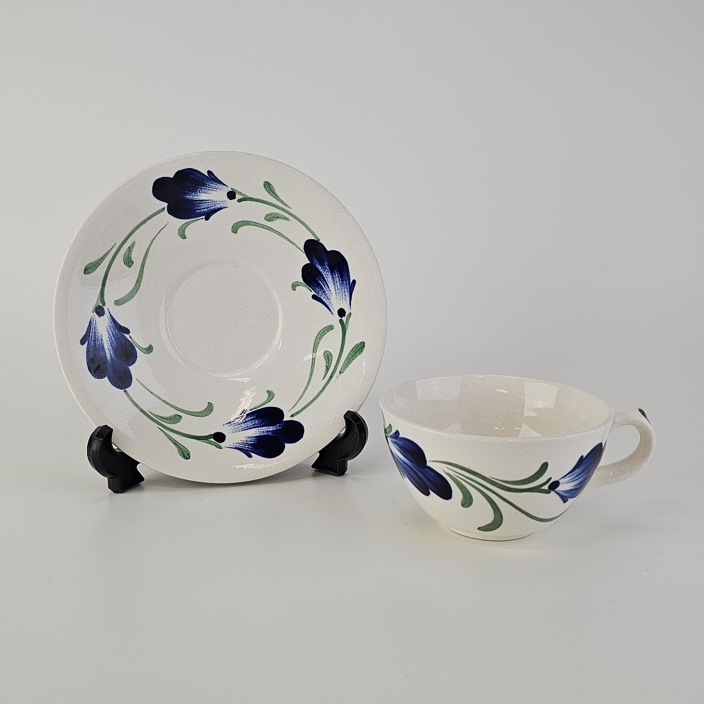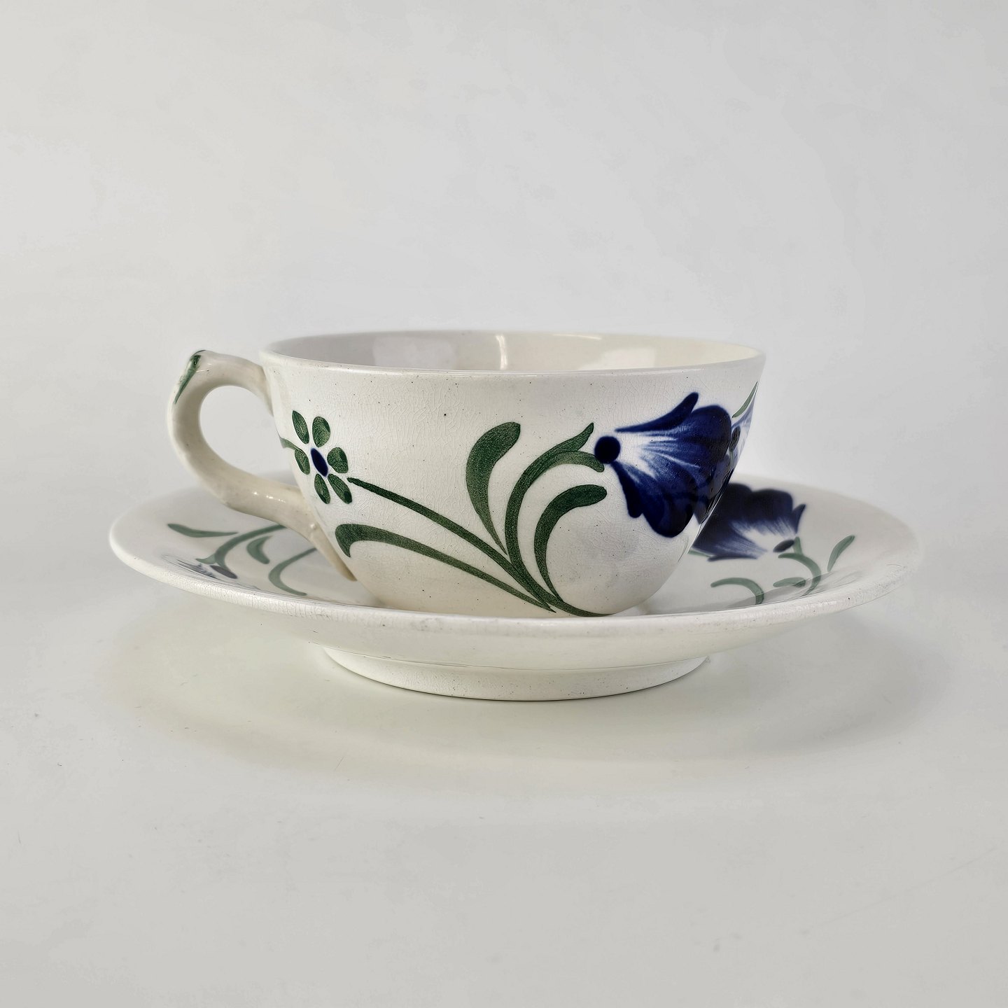 Beskrivelse: Kop med underkop i hvid fajance fra stellet Blå Cenerarier