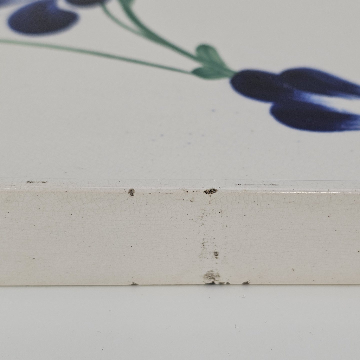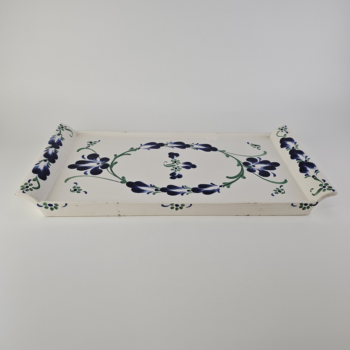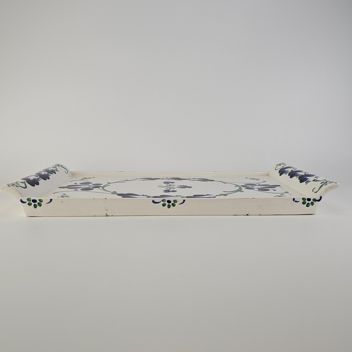 Beskrivelse: Rektangulært fad i hvid fajance fra stellet Blå Cenerarier