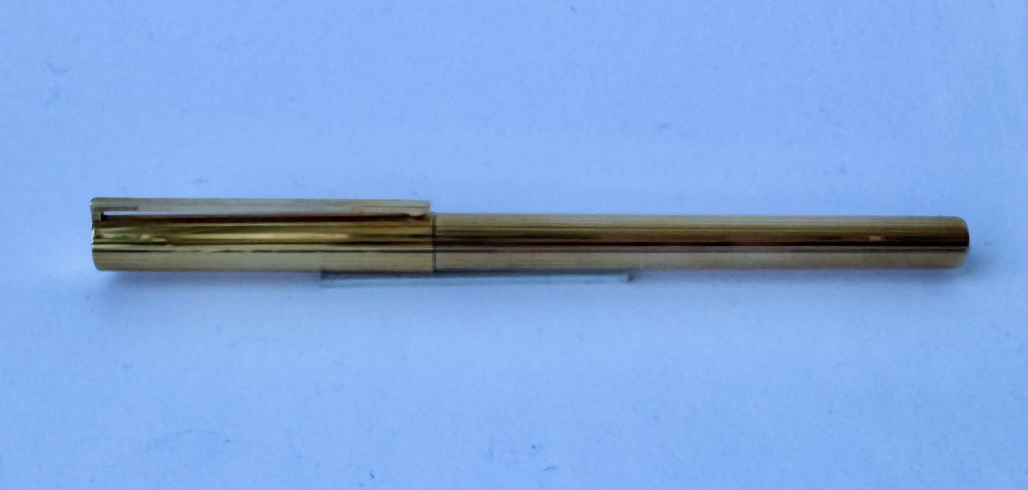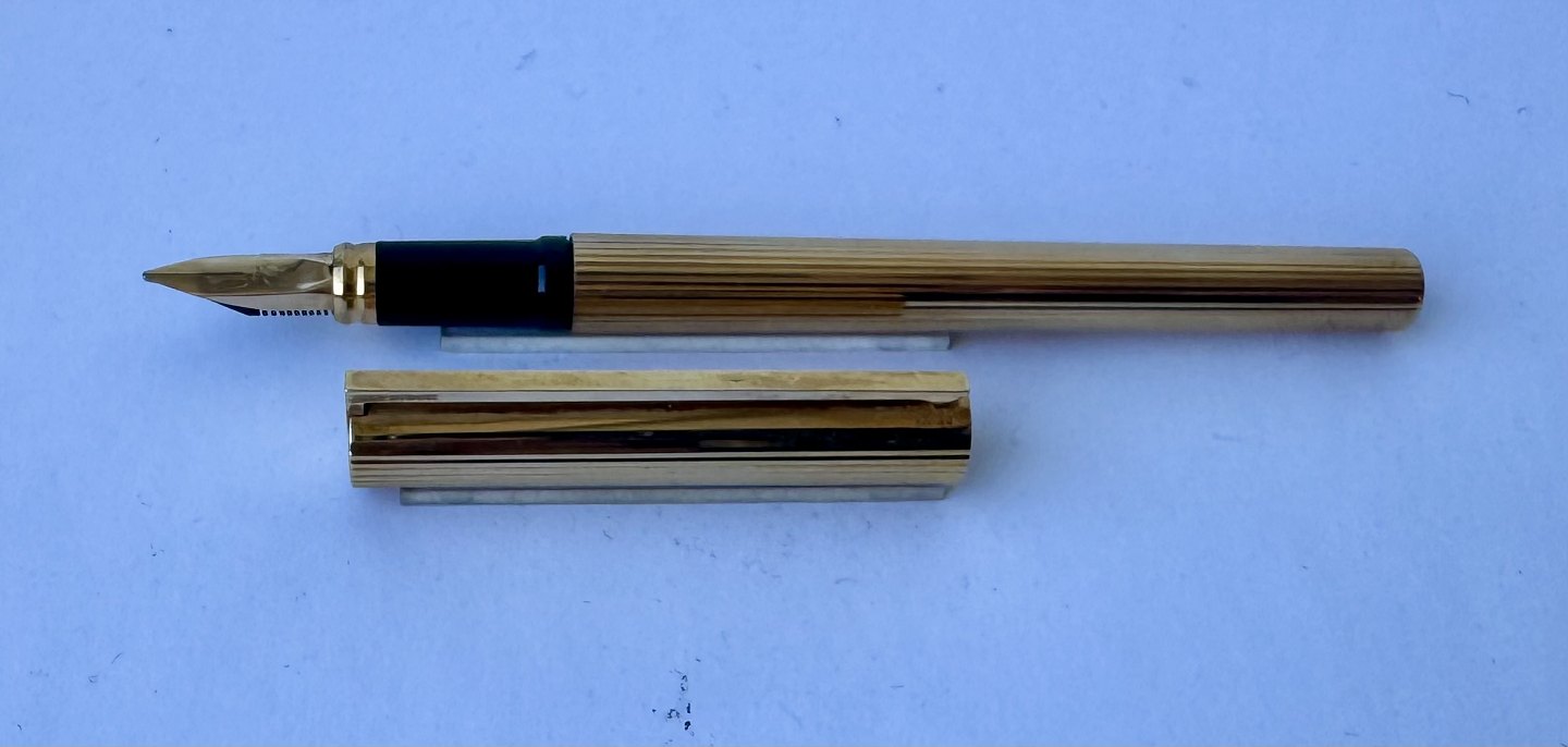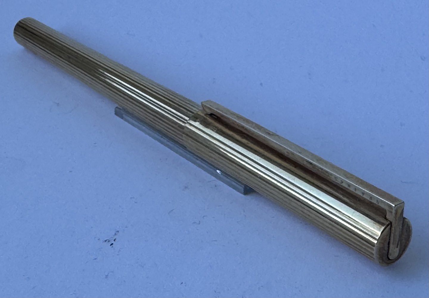 Beskrivelse: Slank S.T. Dupont De Paris 925 Sterling guld-double fyldepen fremstillet i 1970’erne. Alle dele originale inklusiv en 18 karat guldspids. Fremstår i god og skriveklar stand, når der bliver indsat en ny blæk-patron. Ingen skader eller reparationer .L. 13,9 cm