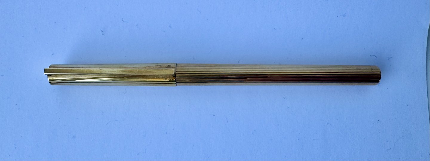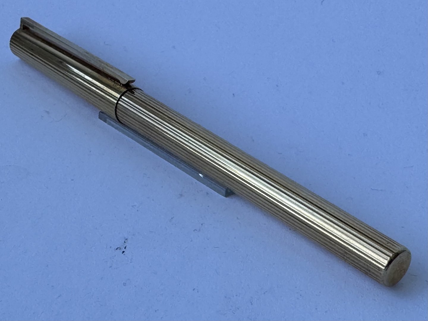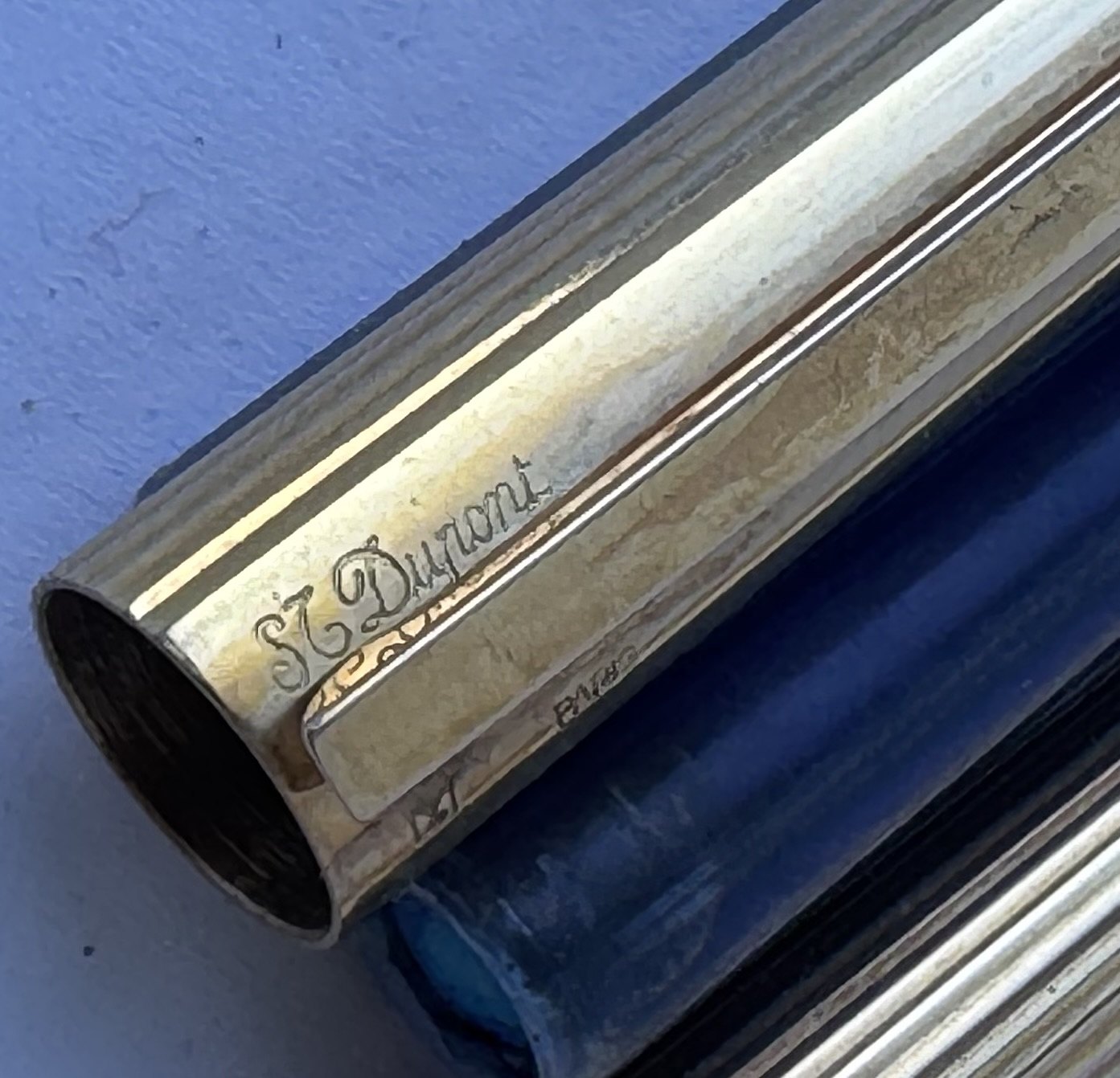 Beskrivelse: Slank S.T. Dupont De Paris 925 Sterling guld-double fyldepen fremstillet i 1970’erne. Alle dele originale inklusiv en 18 karat guldspids. Fremstår i god og skriveklar stand, når der bliver indsat en ny blæk-patron. Ingen skader eller reparationer .L. 13,9 cm