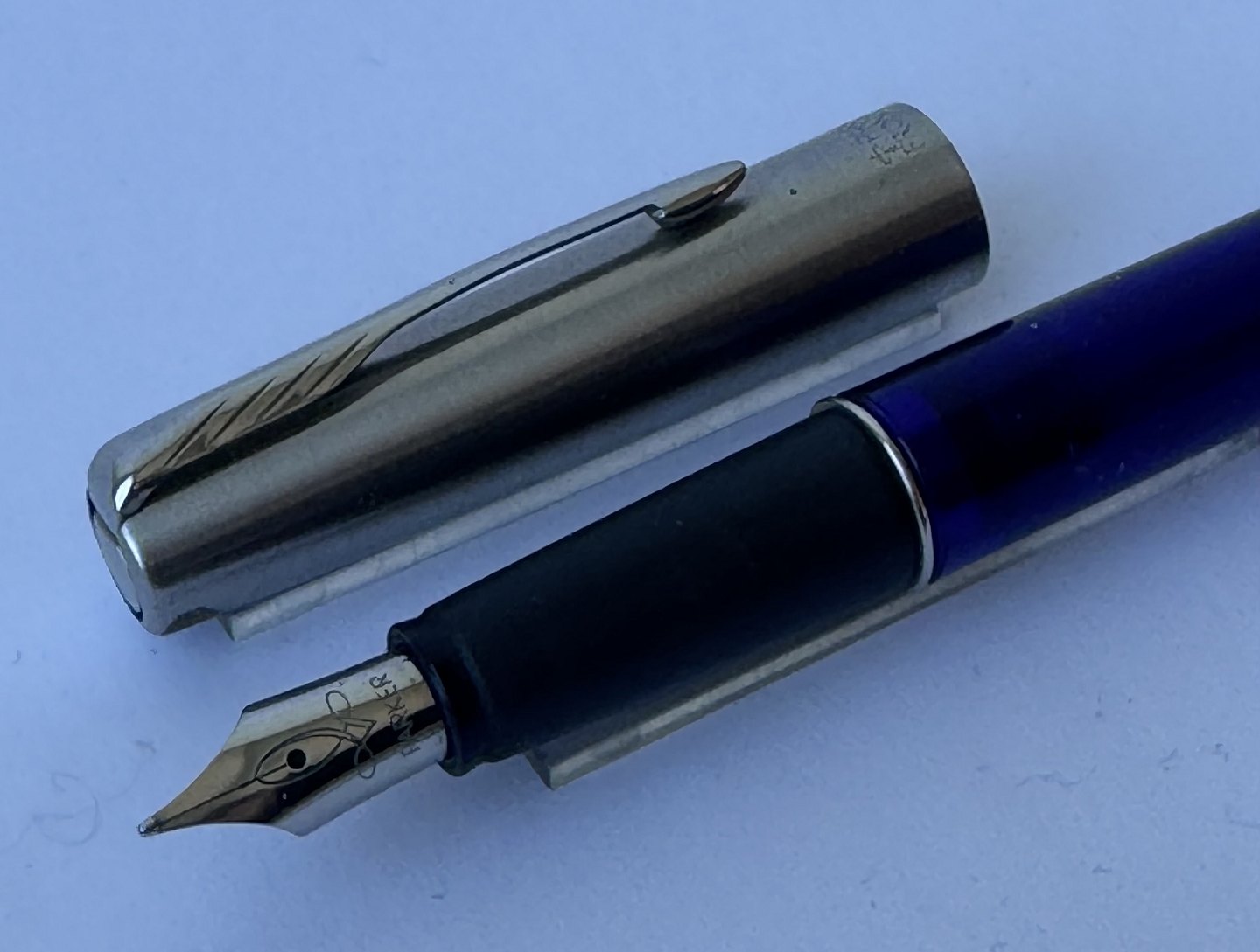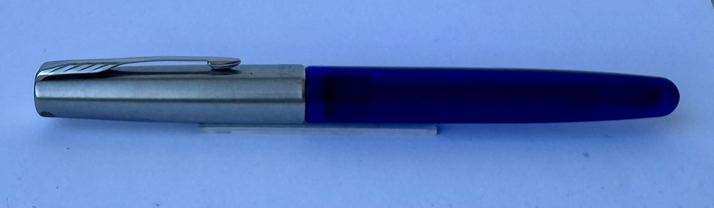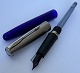 Beskrivelse: Blå Parker Frontier fyldepen med stål hætte. Fremstillet fra midt i 1990’erne. Klar til at blive brugt når der bliver indsat en ny blæk-patron. L. 13,3 cm