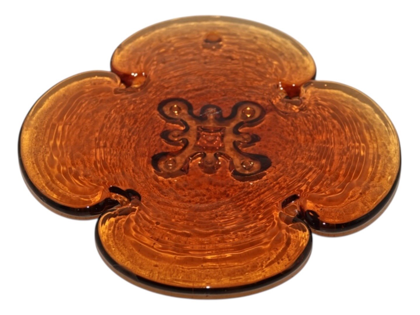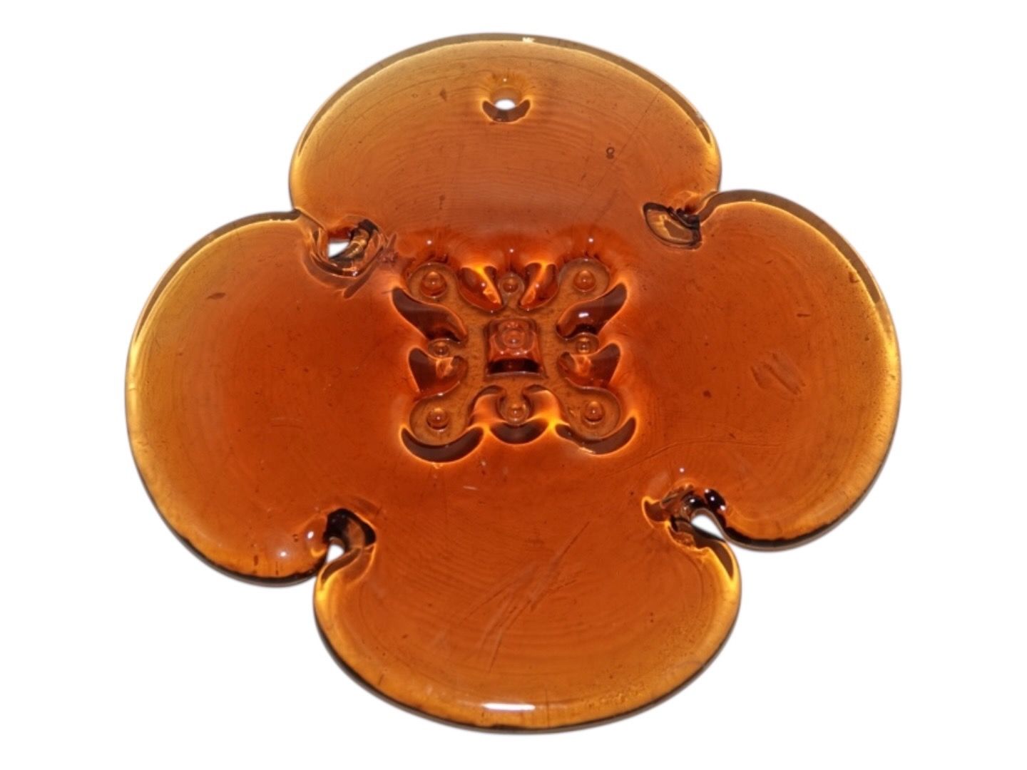 Beskrivelse: Holmegaard, karamelfarvet solfanger i form af firkløver fra 1970'erne.