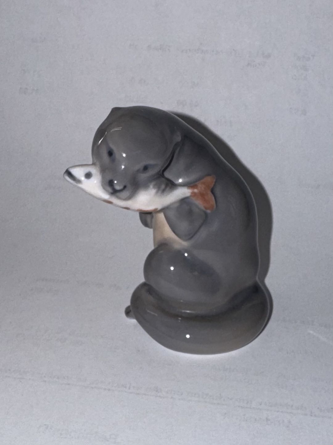Beskrivelse: Figur i porcelæn af odder med fiskefangst i munden fra Royal Copenhagen. 2. Sortering. I god stand uden skader eller reparationer. Fabriksmærket samt Modelnummer 2333 på bunden. H. 5 cm
