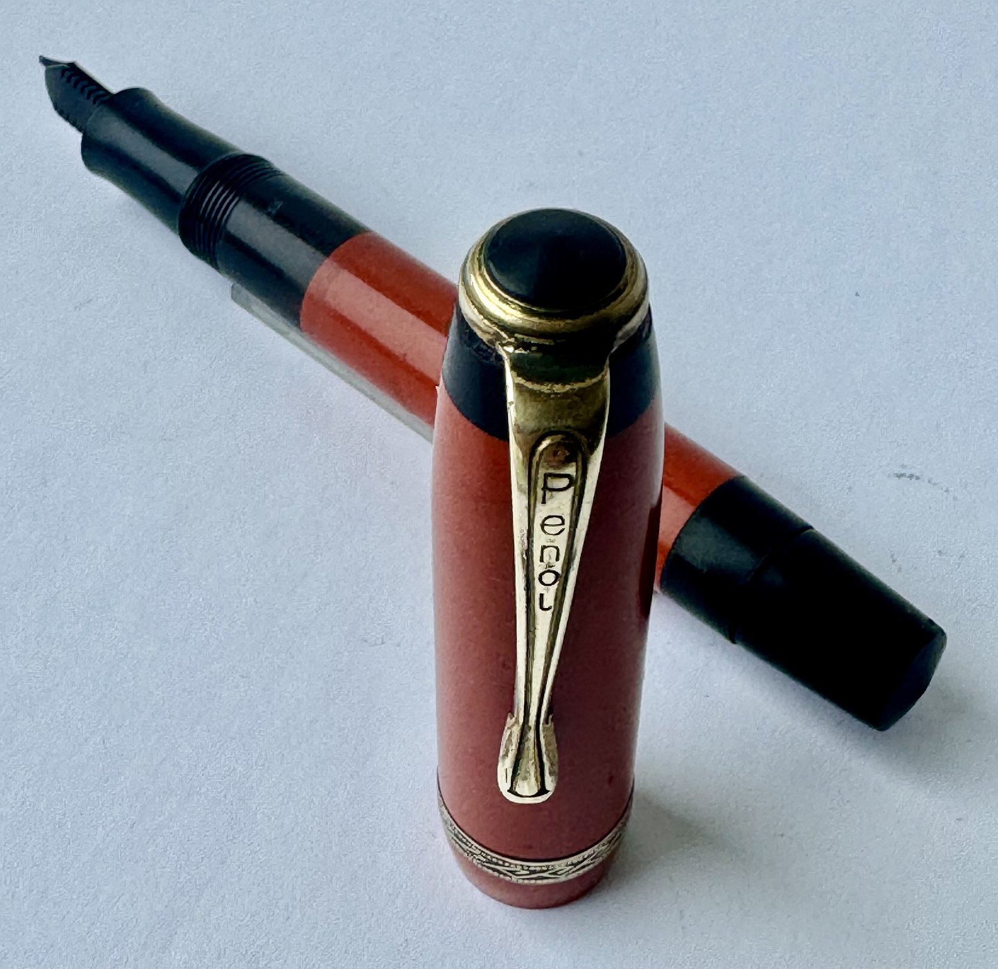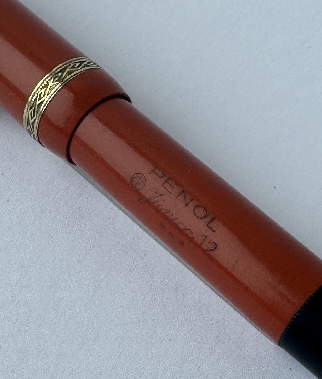 Beskrivelse: Mindre koralrød Penol Junior 12 fyldepen. Push button filler. Der skal indsættes en ny gummisæk før den igen kan optage blæk og skrive igen. Ny gummisæk kan indsættes for et tillæg på kr. 250,- Alle dele originale til denne model. Ingen skader eller reparationer. Lette almindelige brugsspor på overfladen. Længde 11,7 cm