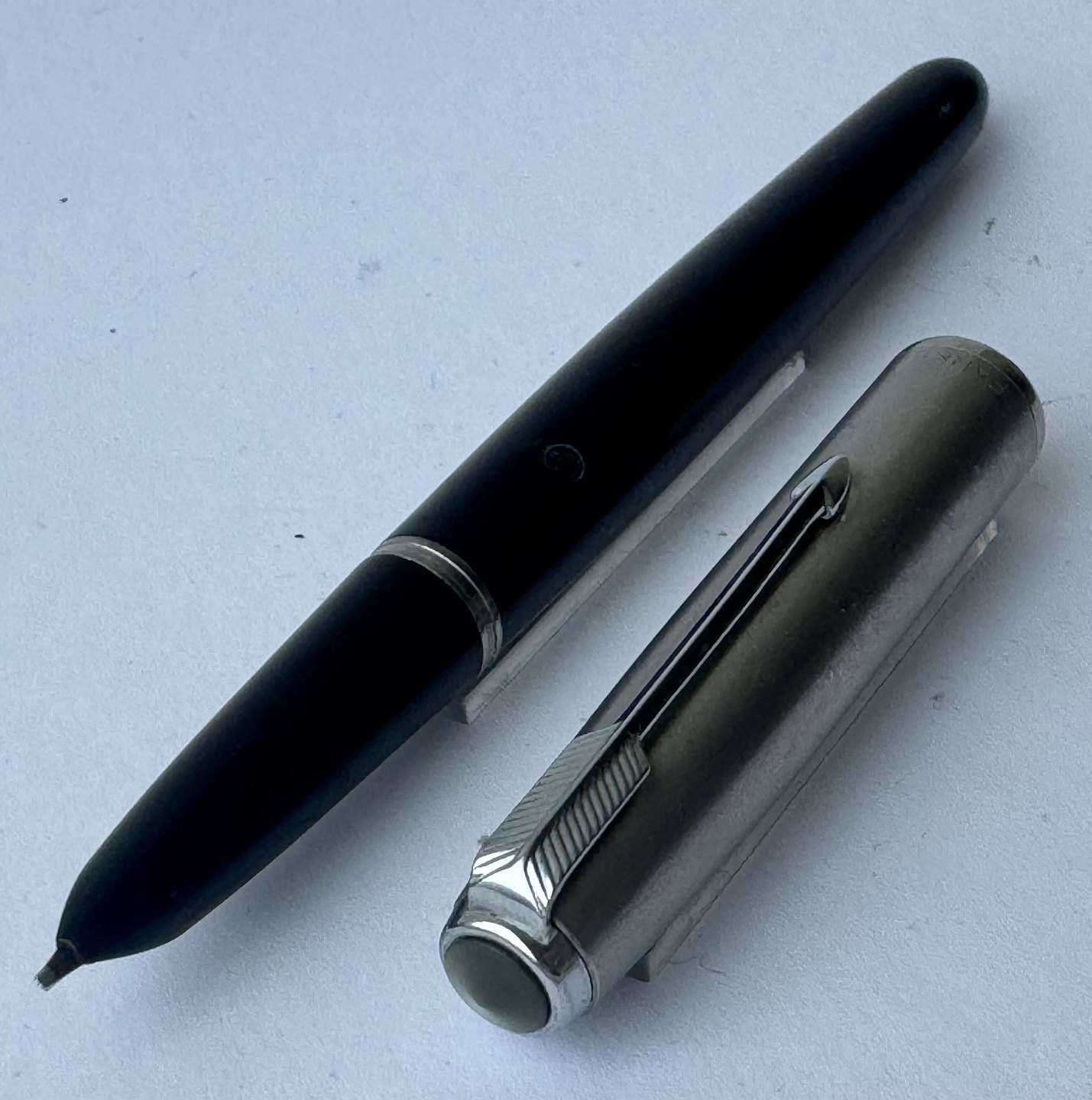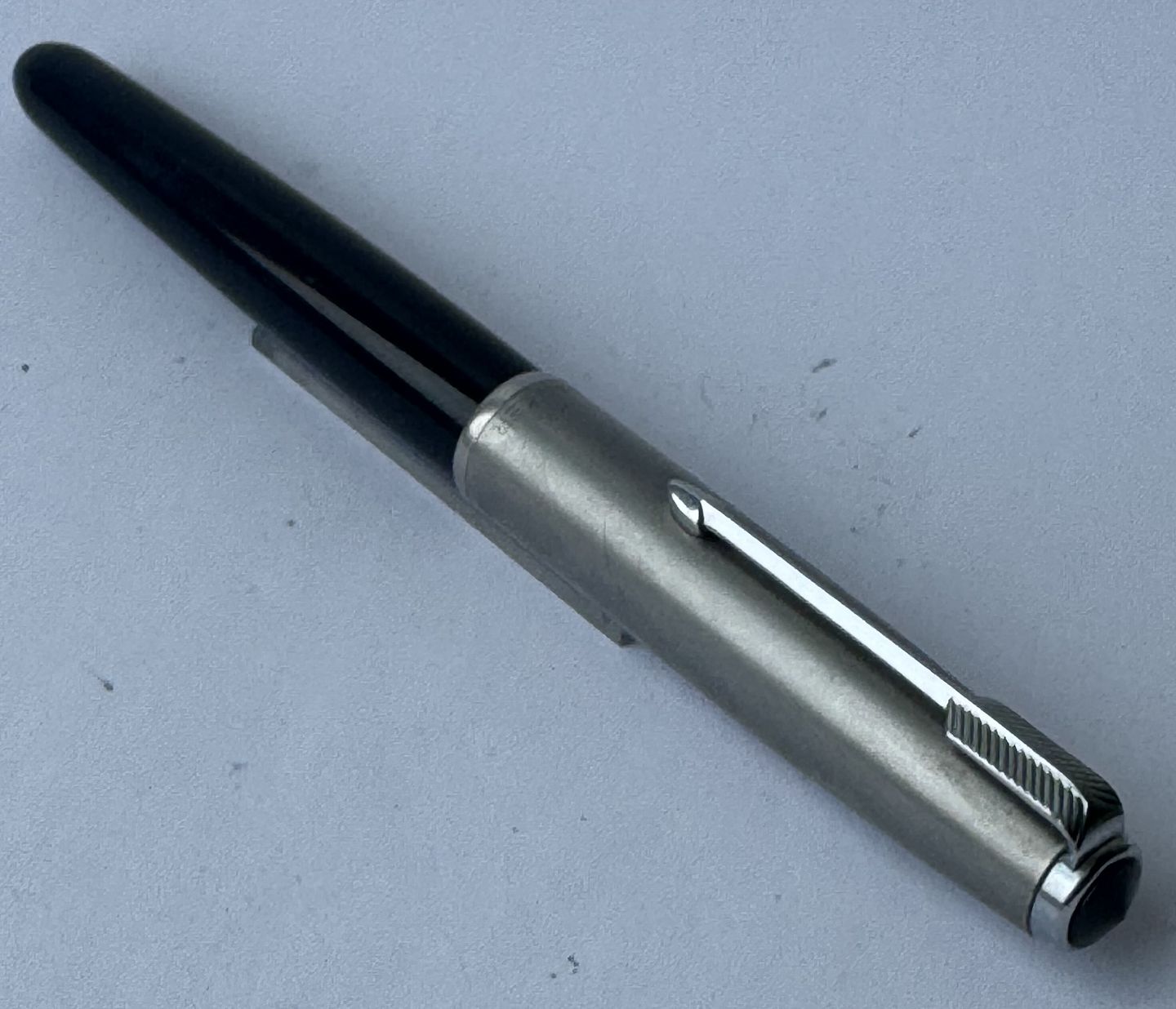 Beskrivelse: Sort Parker 51 fyldepen med hætte i stål fra 1950’erne. Fremstår i god og funktionsdygtig stand. Ingen fejl eller mangler at beskrive. På siden ses “the danish anchor”, som er fyldepenne producenten og forhandleren Christian Olsens firmalogo. Fyldepenne der var importeret til Chr. Olsens fabrikker blev stemplet med dette logo lige såvel som virksomhedens egne produkter, eksempelvis Penol.