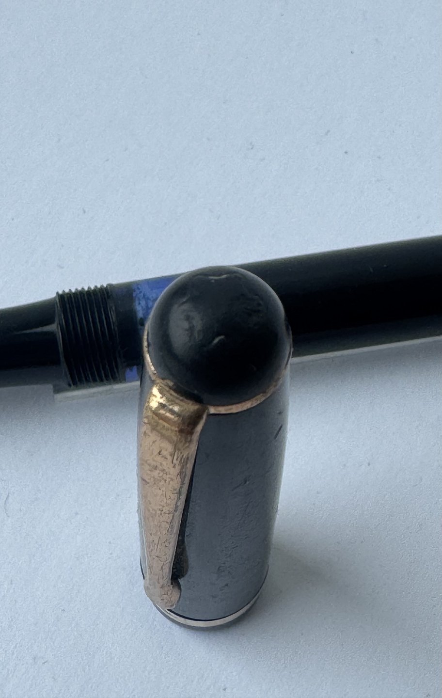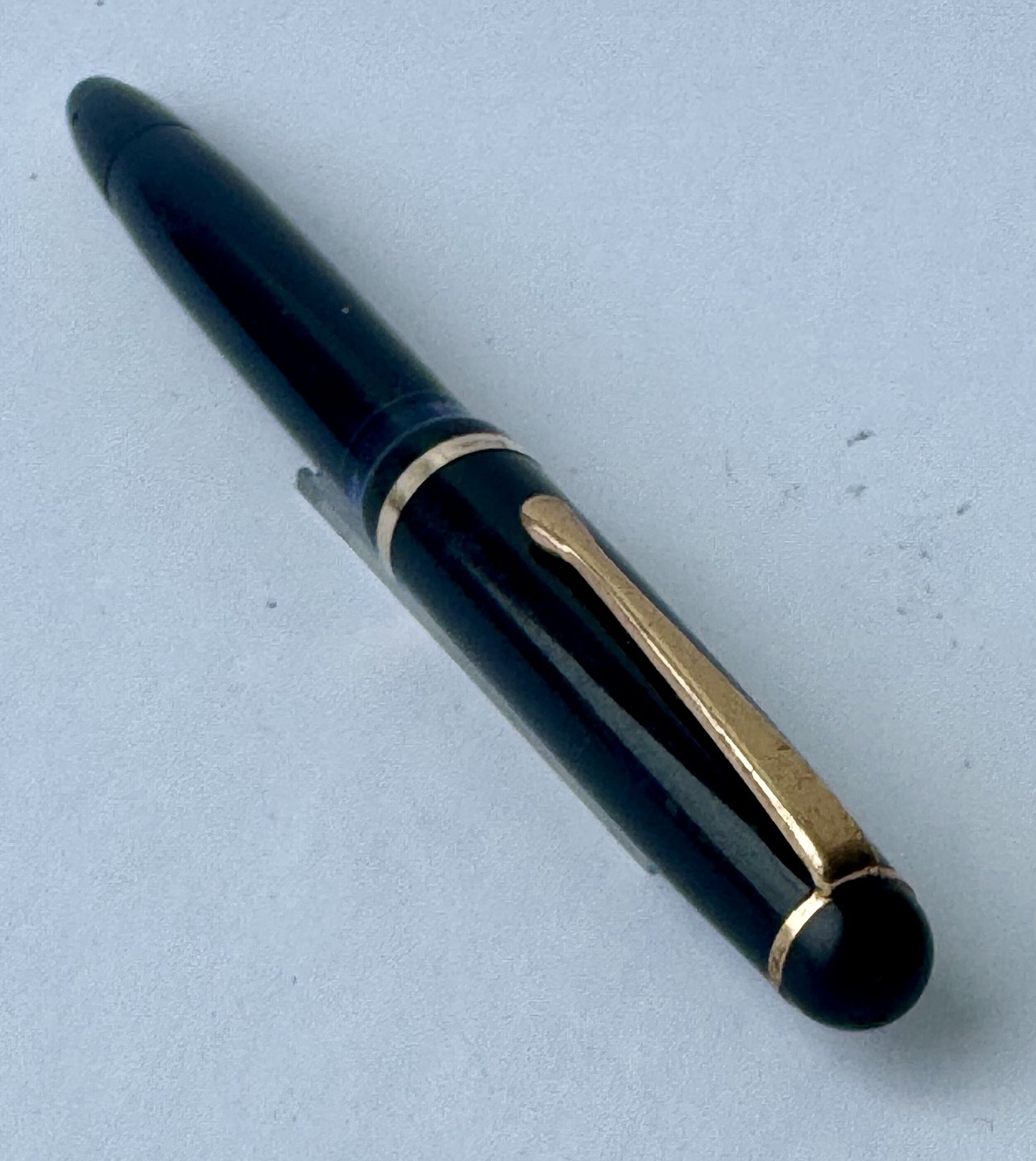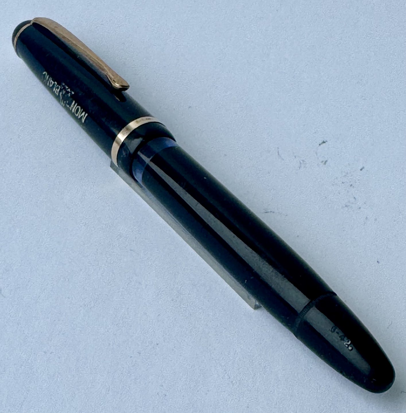 Beskrivelse: Sort Montblanc 3-42 fyldepen fra 1950’erne. Piston blæk-påfylder. Denne mekanisme fungerer fint, hvorfor pennen er klar til at blive brugt. Alle dele originale til denne model. Inklusiv en nr. 2 Montblanc stålspids. Ingen skader eller reparationer. Længde 12,7 cm