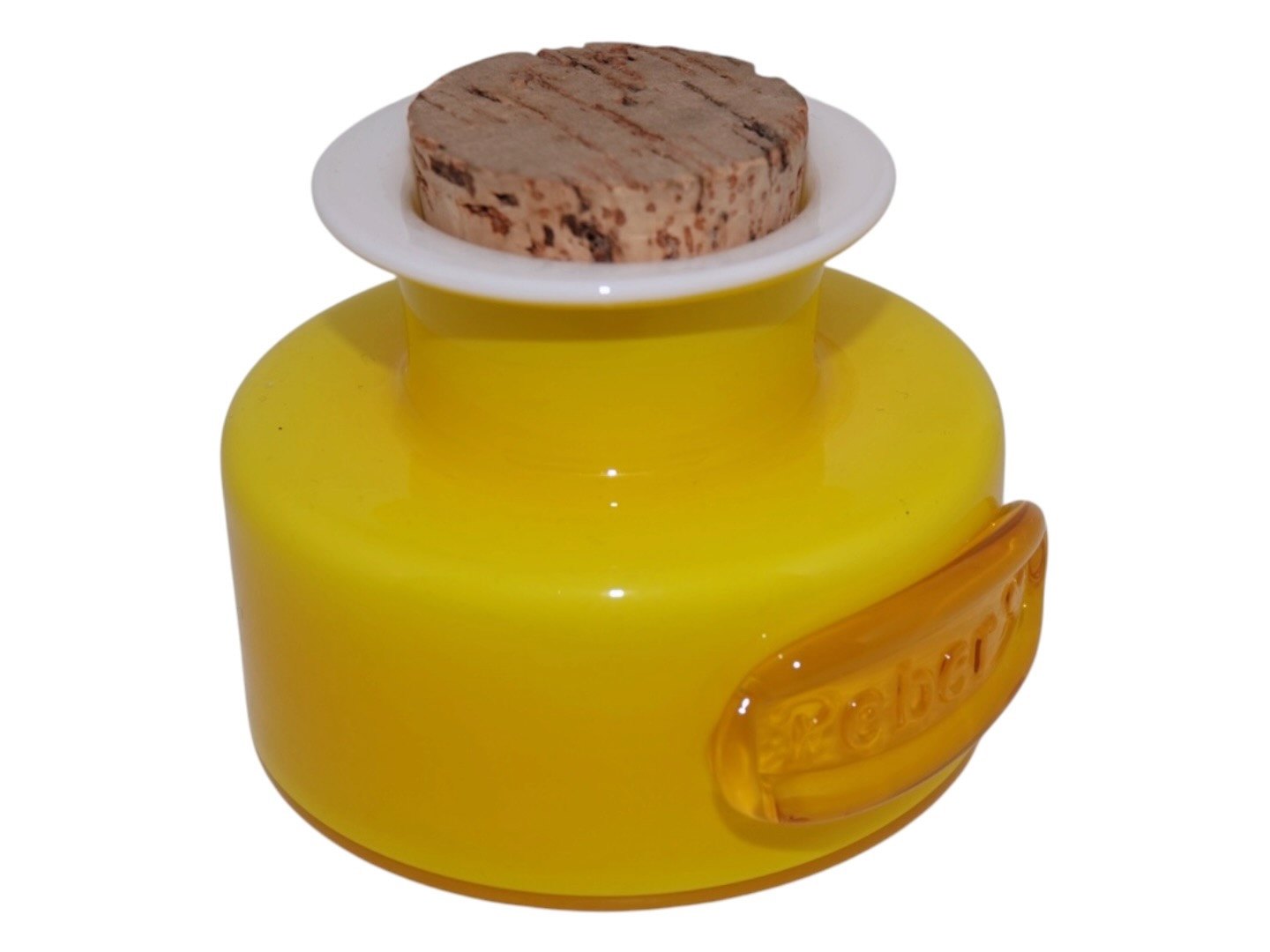 Beskrivelse: Holmegaard Palet gul krydderikrukke med teksten "Peber".