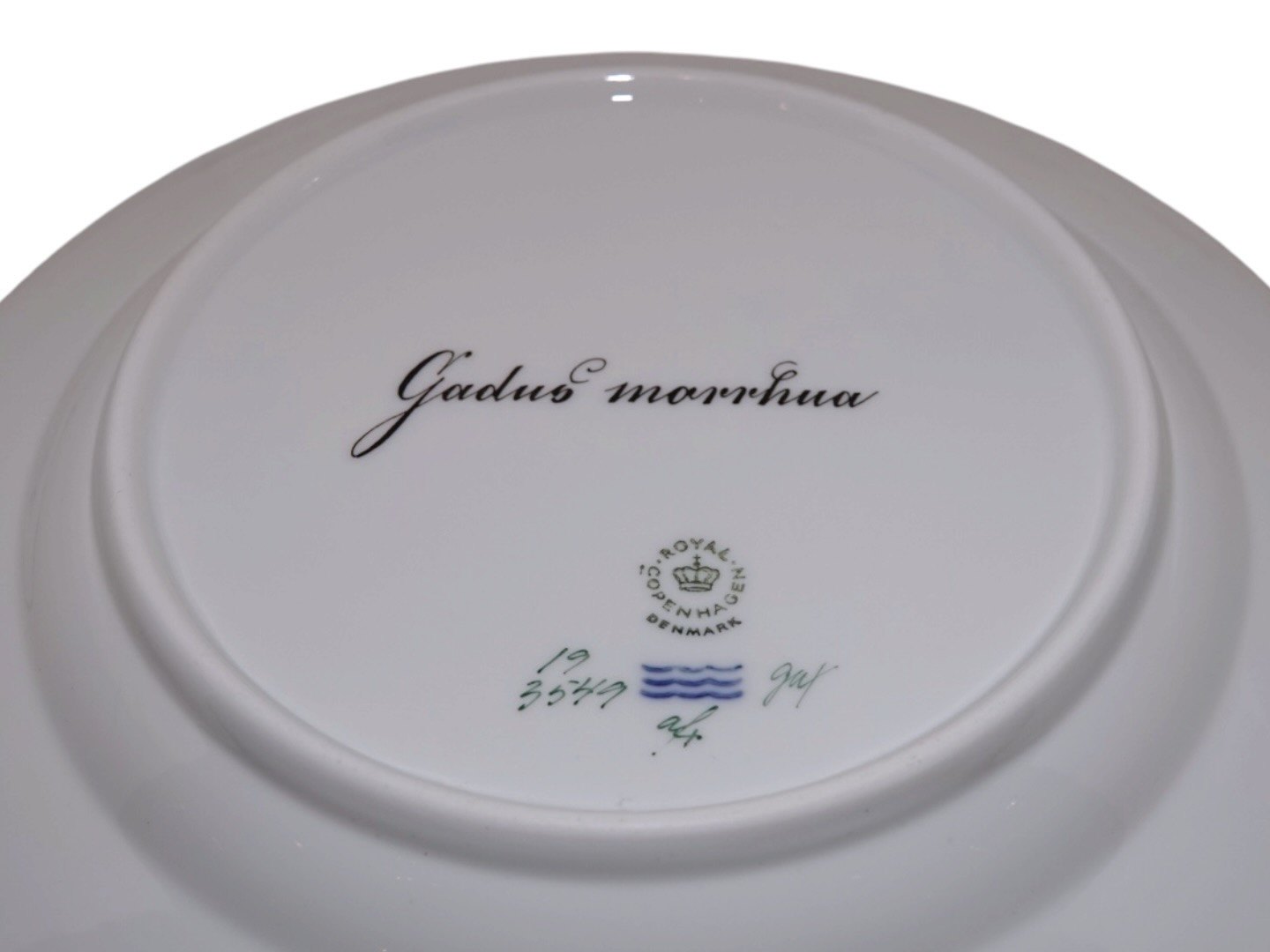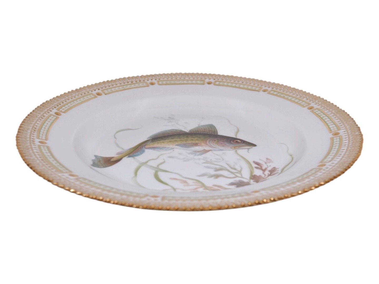 Beskrivelse: Royal Copenhagen Flora Danica, middagstallerken dekoreret med fisk.