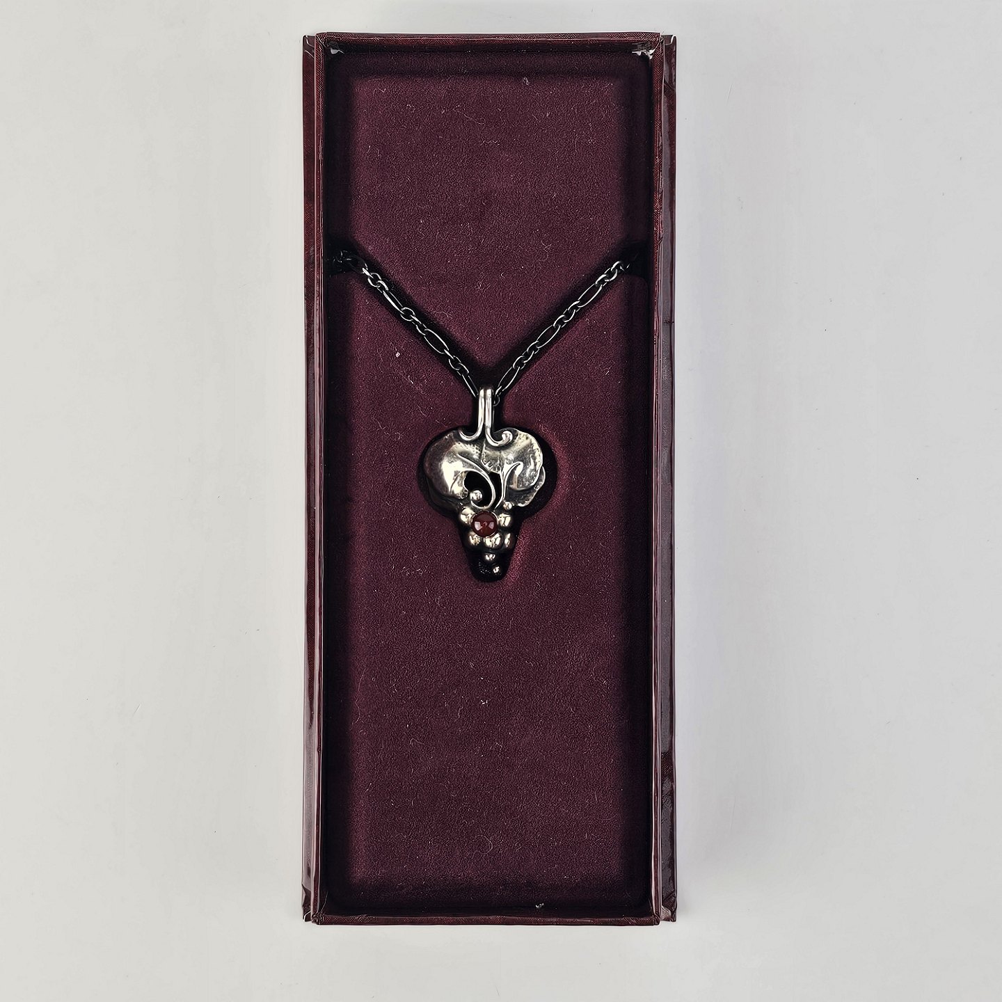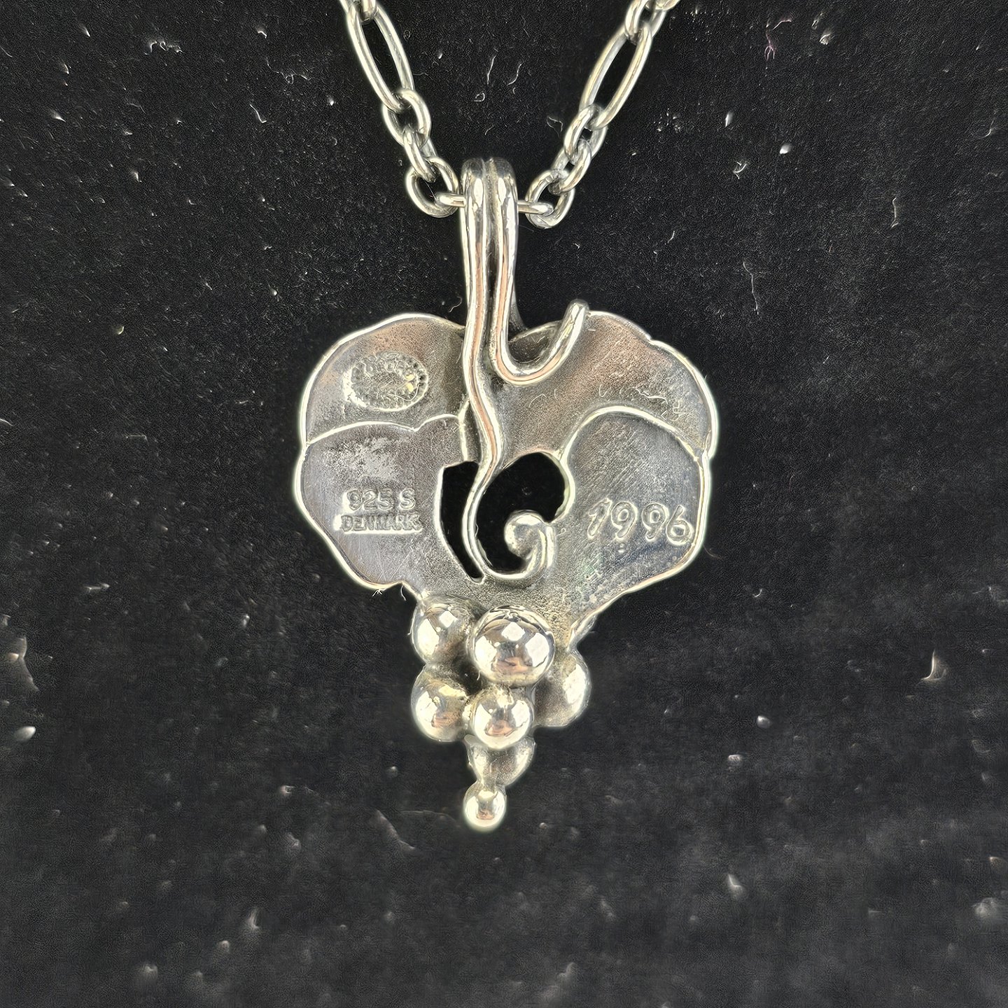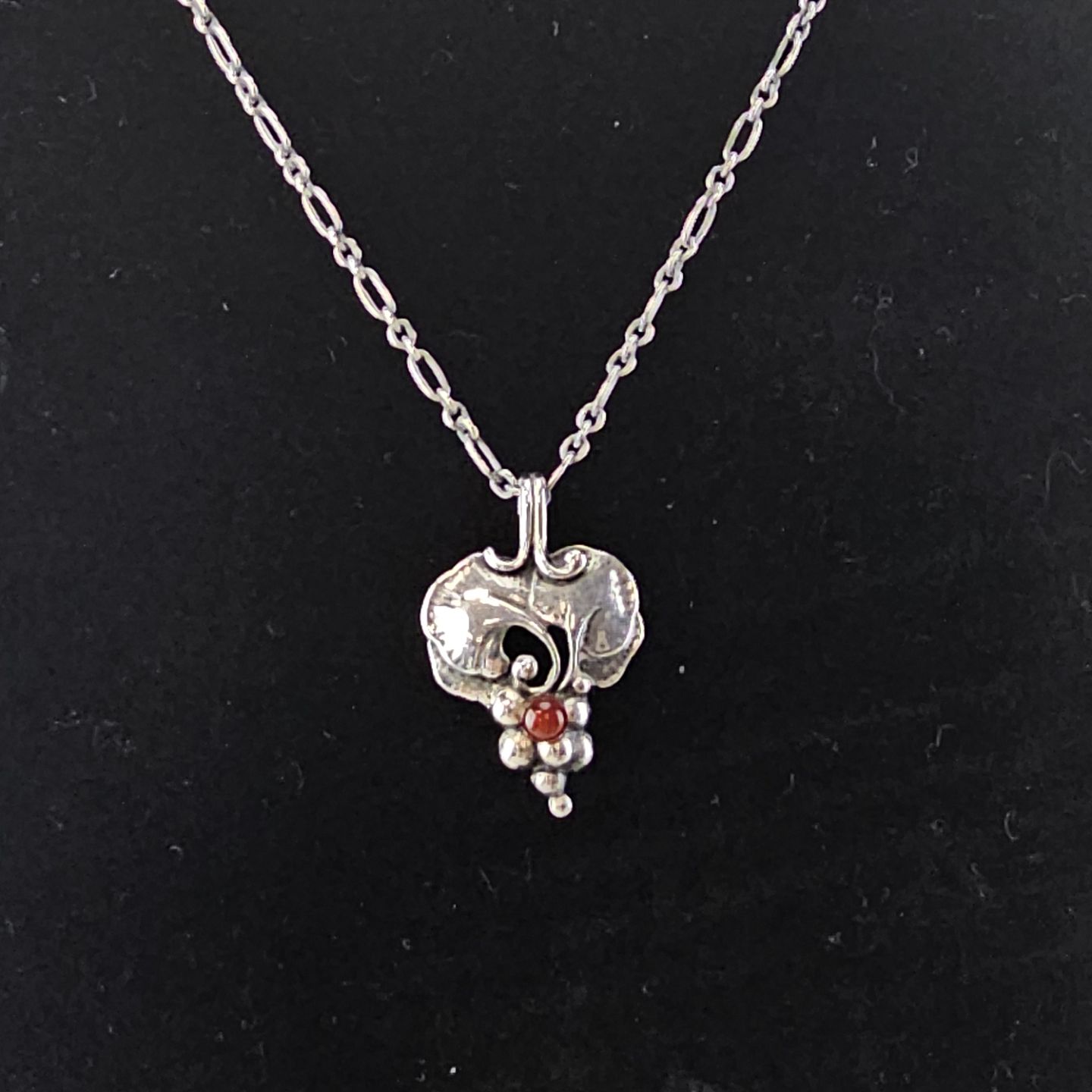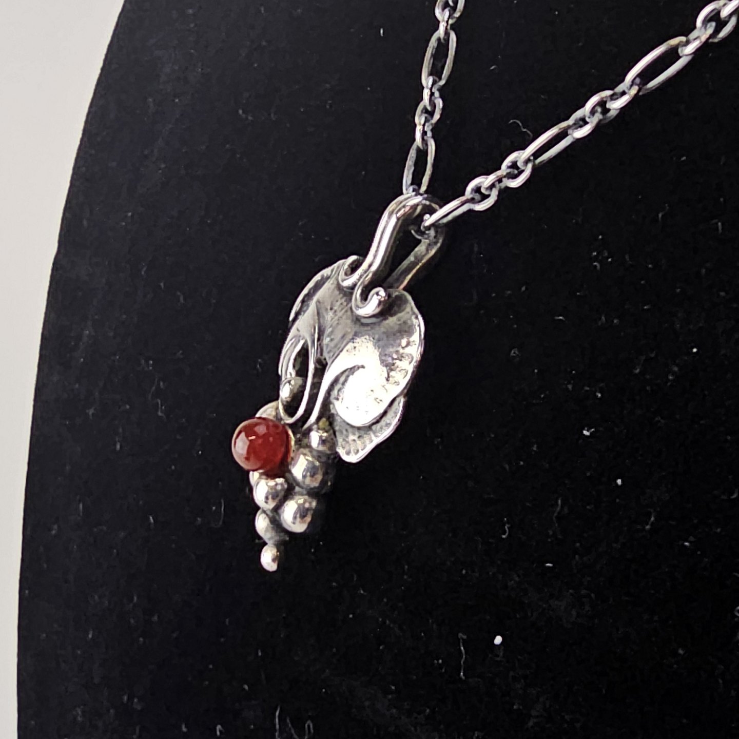 Beskrivelse: Vedhæng i sterling sølv med motiv af en klase druer, og karneol perle.