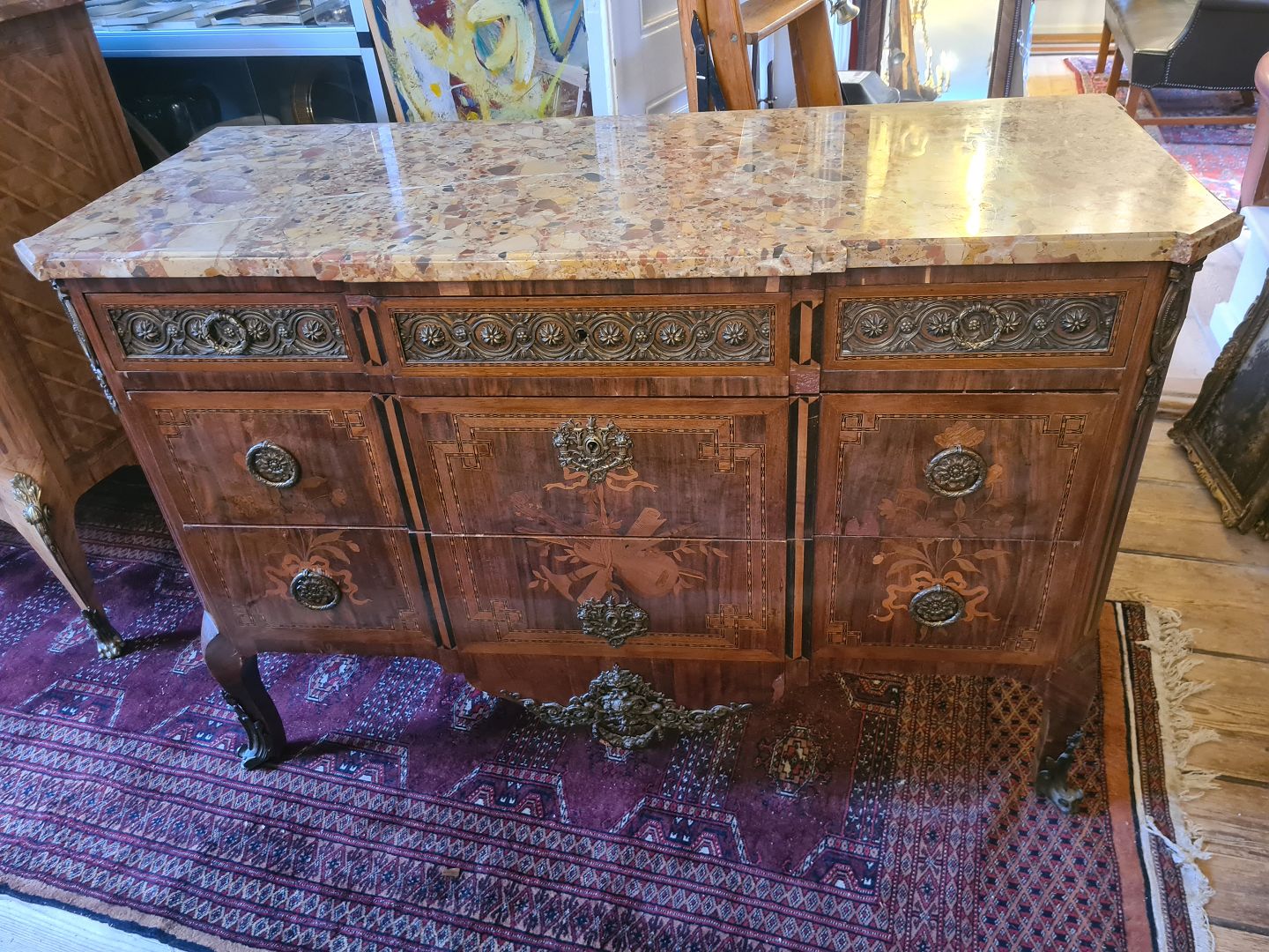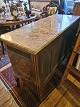 Beskrivelse: Antik kommode fra sidst i 1800 tallet i rokokostil med løstliggende marmorplade på toppen. Fremstår pæn og funktionsdygtig dog med enkelte finér skader øverst på skufferne (billede) og umiddelbart uden nøgle.
