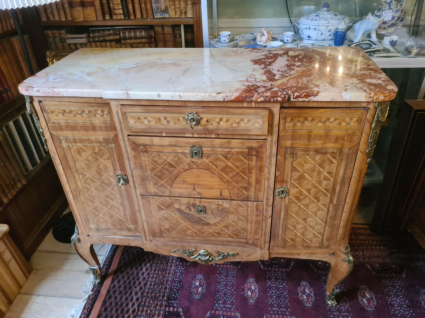 Beskrivelse: Kommode fra sidst i 1800 tallet. Fremstillet i rokokostil med låger og løstliggende marmorplade på toppen. Fremstår pæn og velholdt uden de store brugsspor.