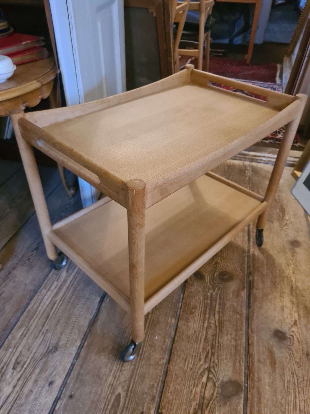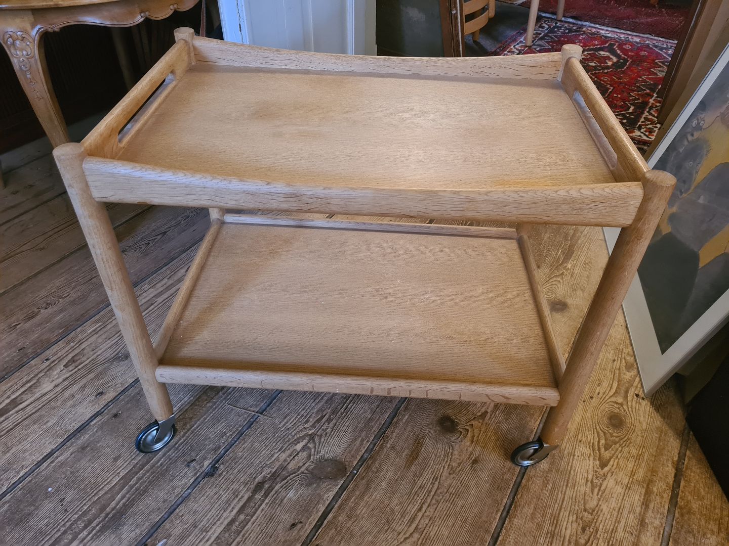 Beskrivelse: Rullebord i eg designet af Hans J. Wegner og fremstillet hos Andreas Tuck. Fremstår pænt og velholdt uden de store brugsspor.