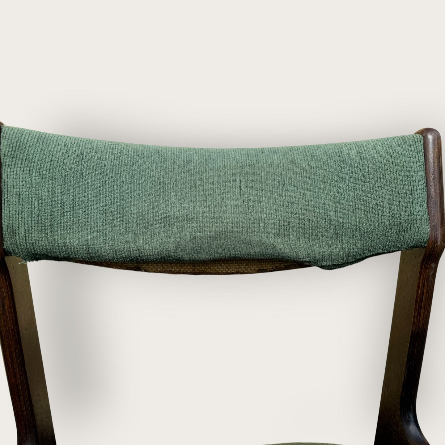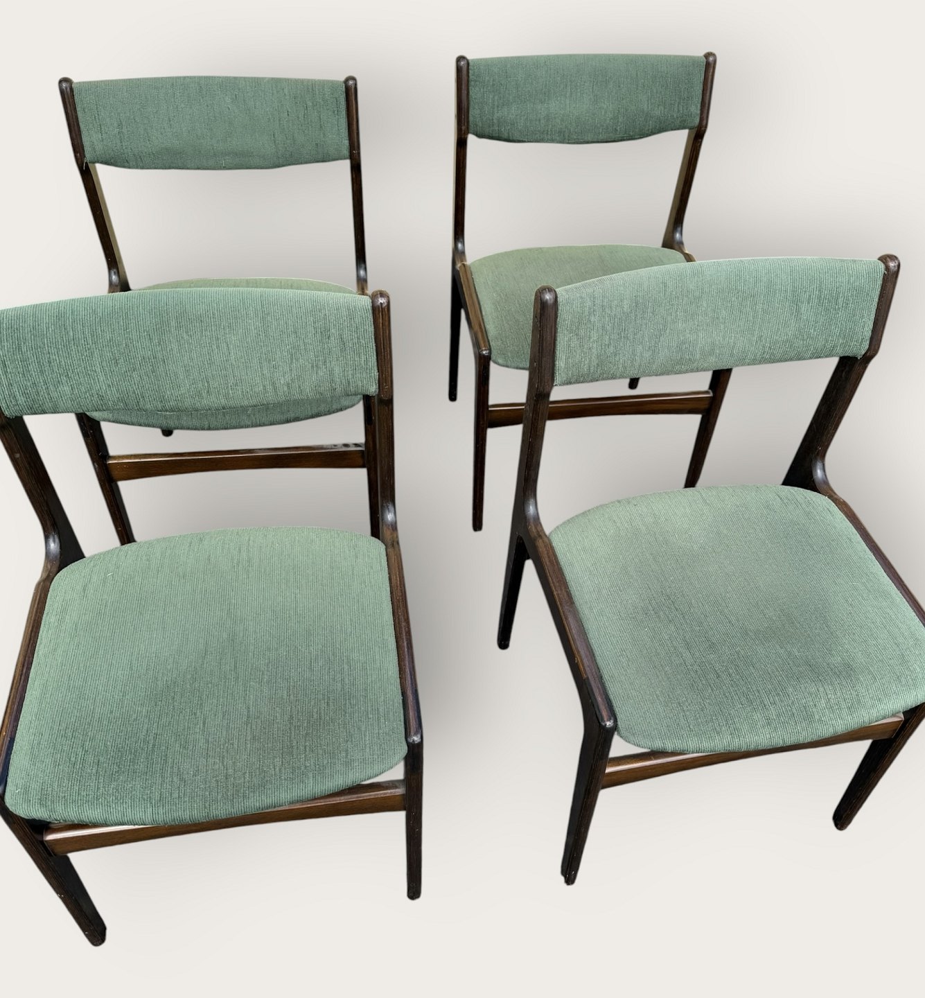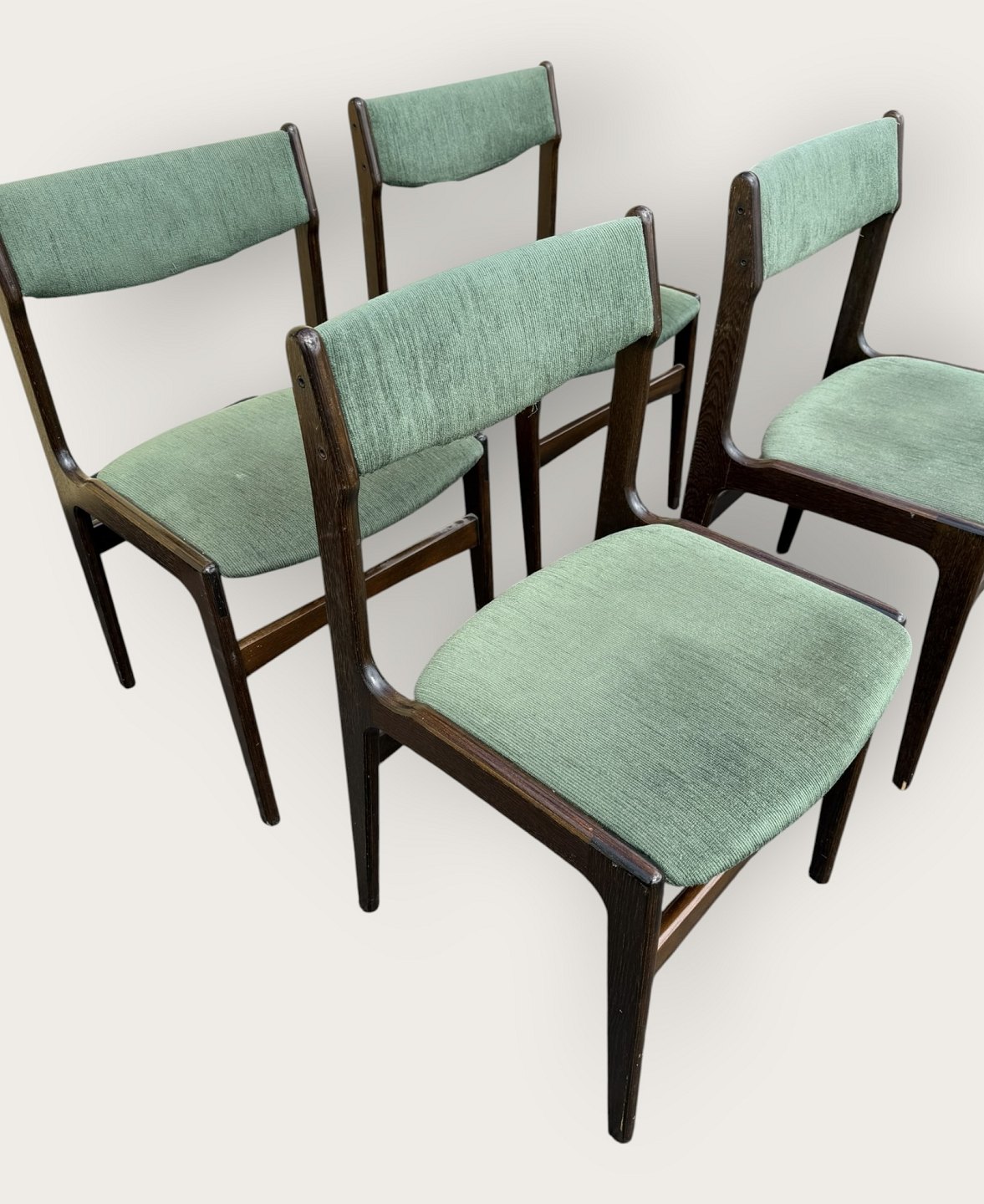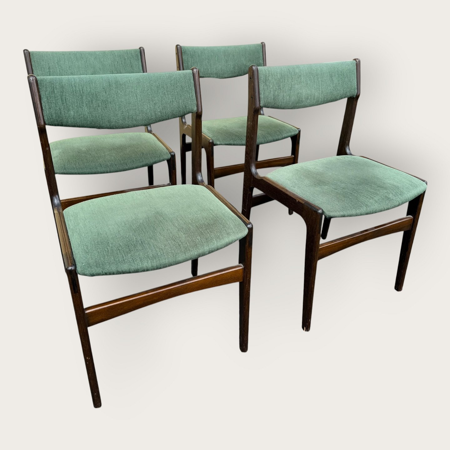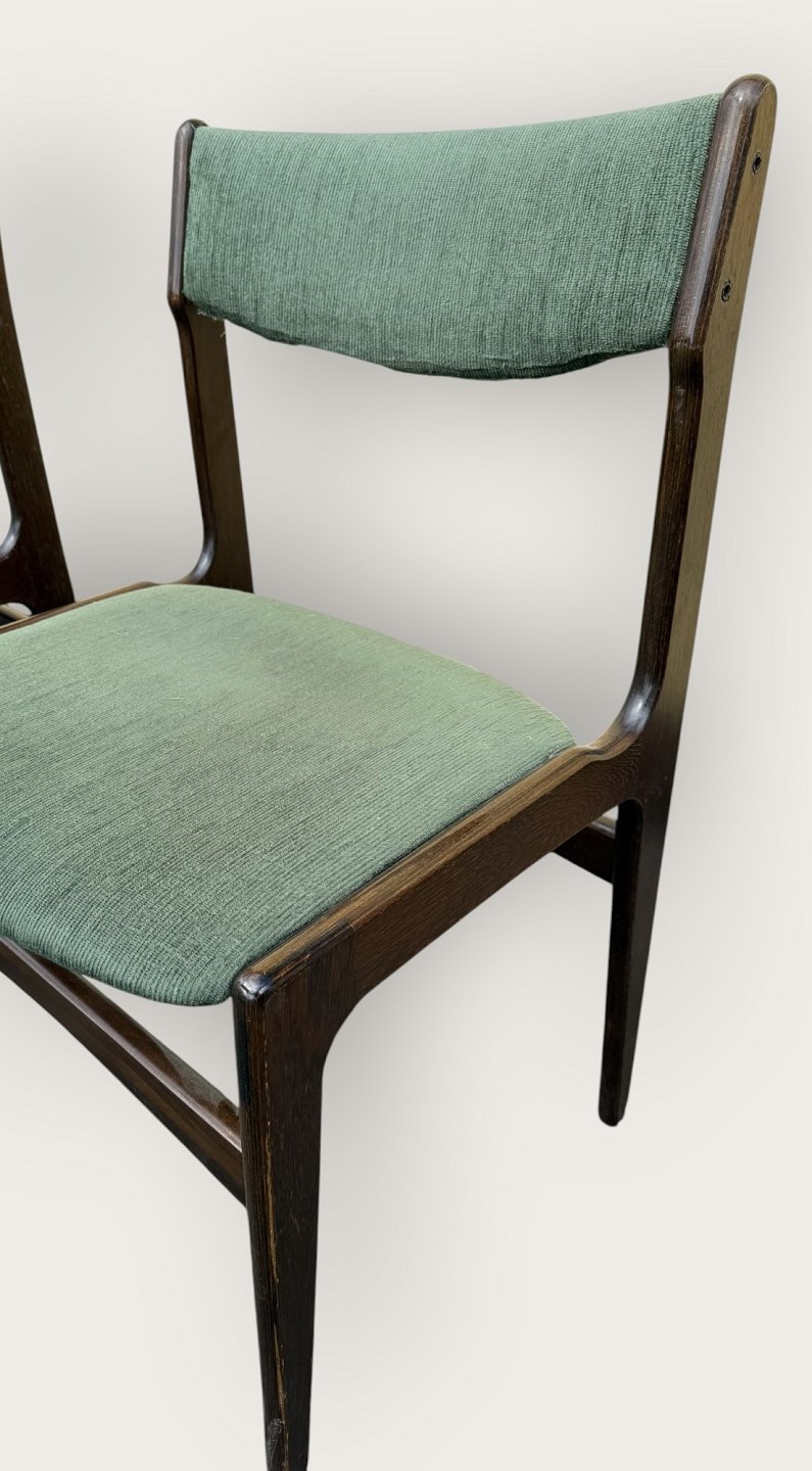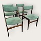 Beskrivelse: 4 stole i mørkt bejdset træ, danish modern fra 1960'erne, stolene er stabile og i pæn brugt stand, men betrækket er plettet / løst.
