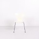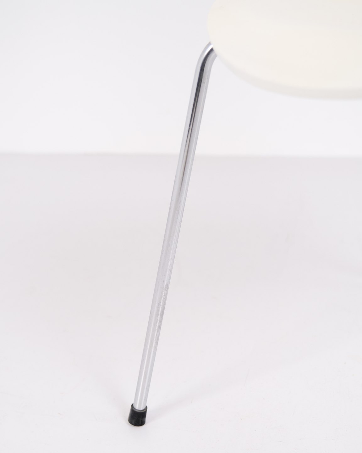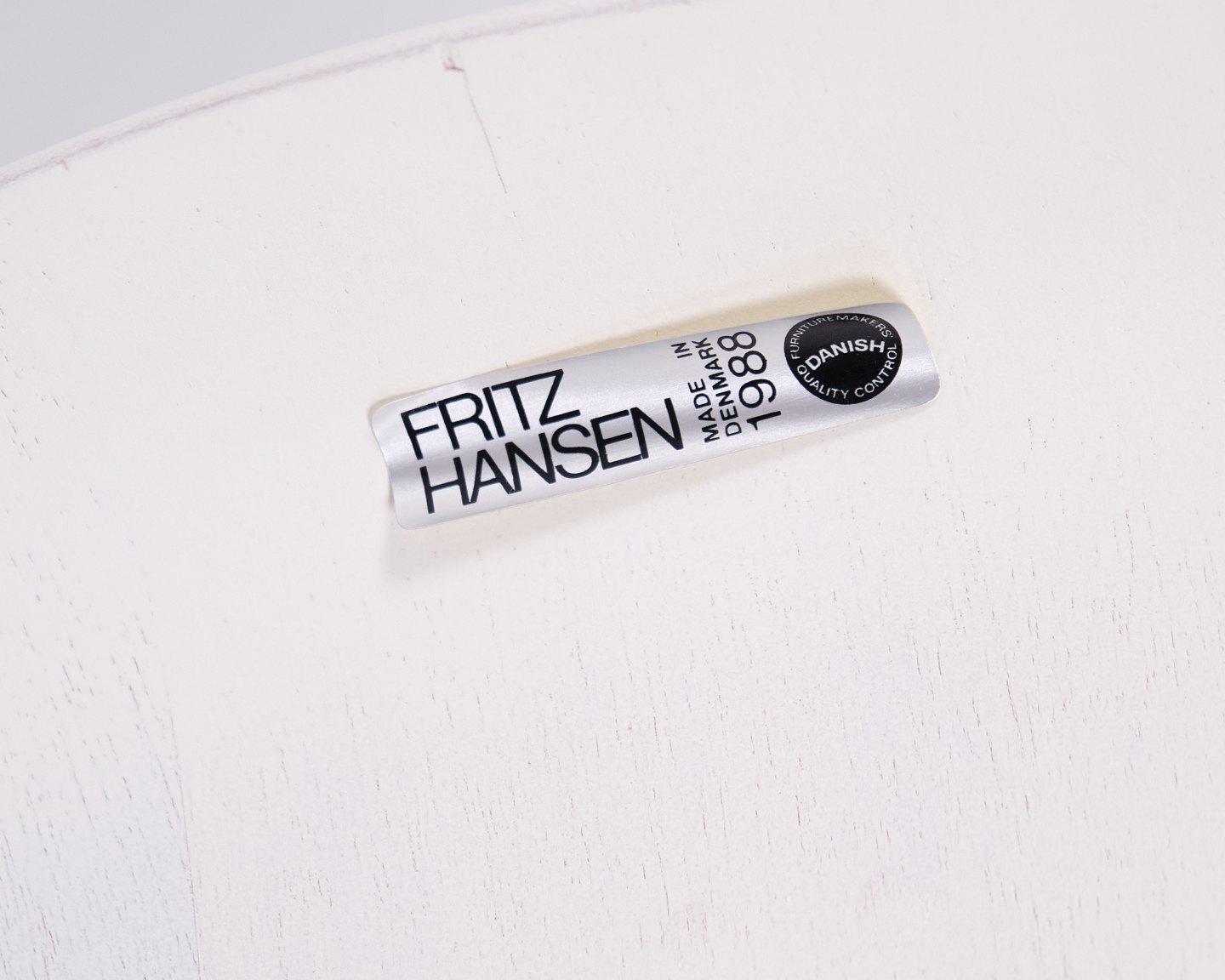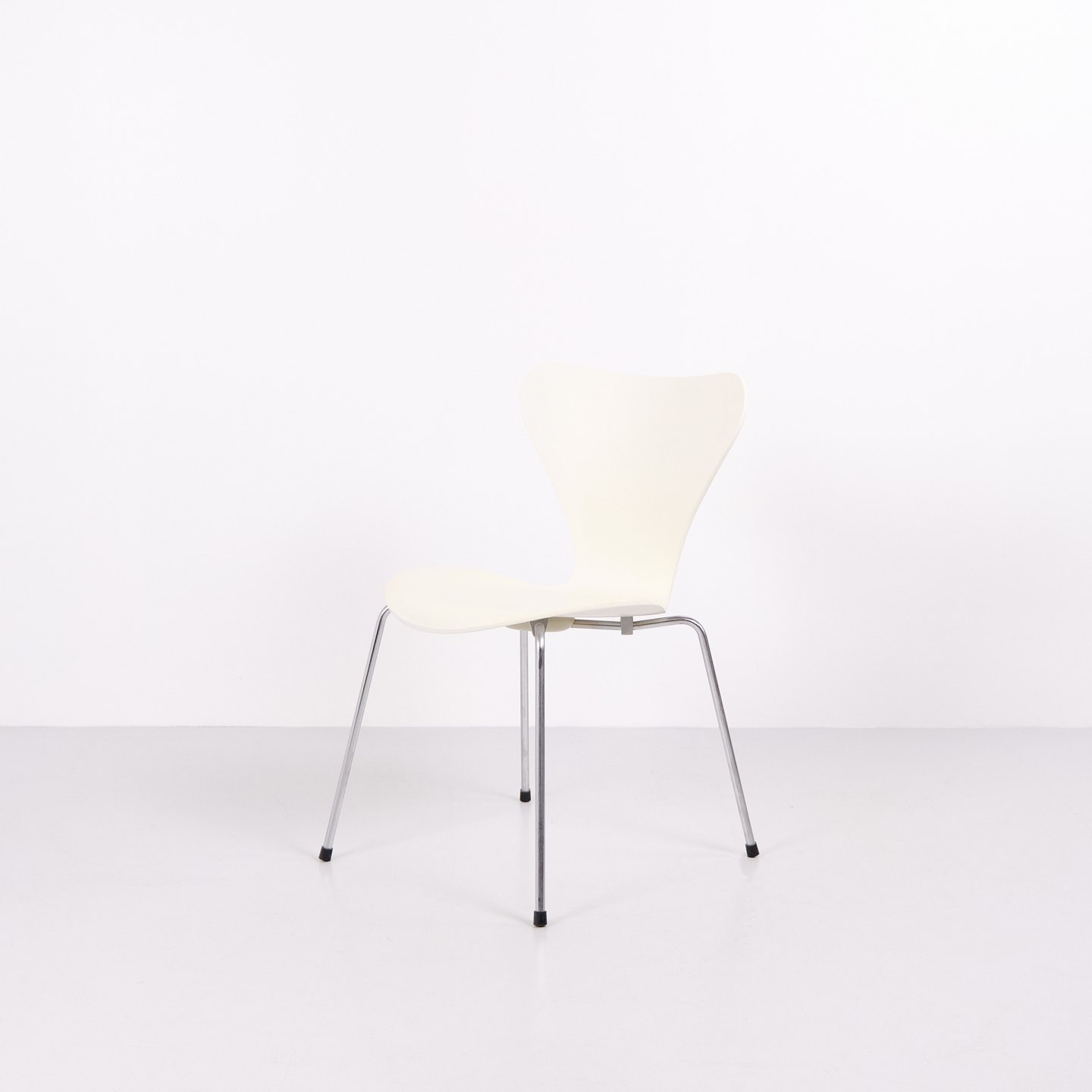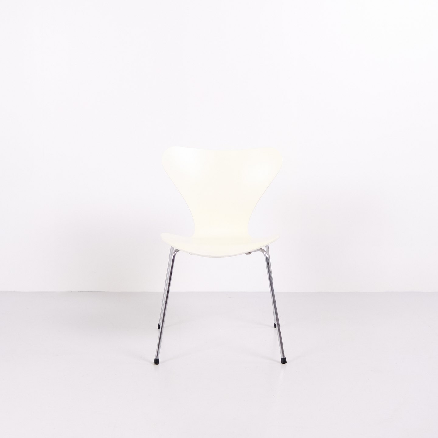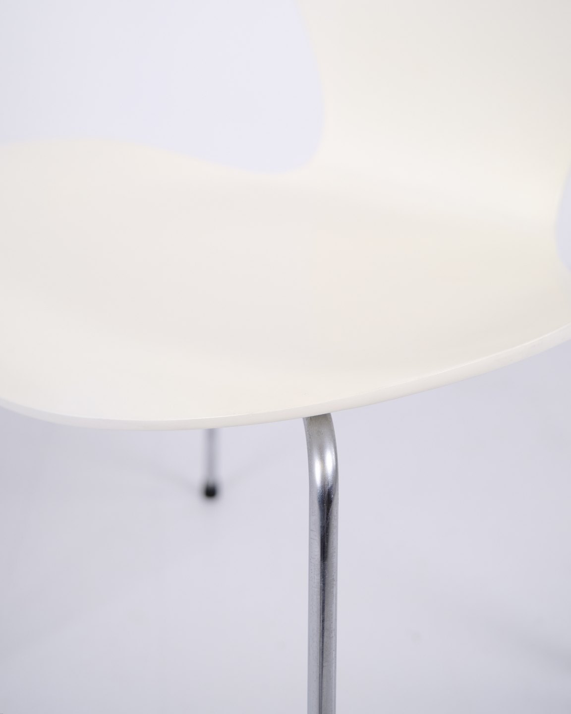 Beskrivelse: Sæt af 6 Syverstole model 3107 designet af Arne Jacobsen for Fritz Hansen. Modellen blev introduceret i 1955 og er en videreudvikling af Myren fra 1952. Stolen er udført i formspændt finér med hvidlakeret overflade og forkromet stålrørsstel. Den karakteristiske syvtalsform gjorde modellen til en af de mest producerede stole i dansk designhistorie. 3107 har været anvendt i private hjem, restauranter, kontorer og offentlige interiører verden over og produceres fortsat af Fritz Hansen. Sælges kun samlet.