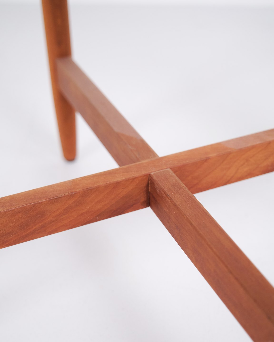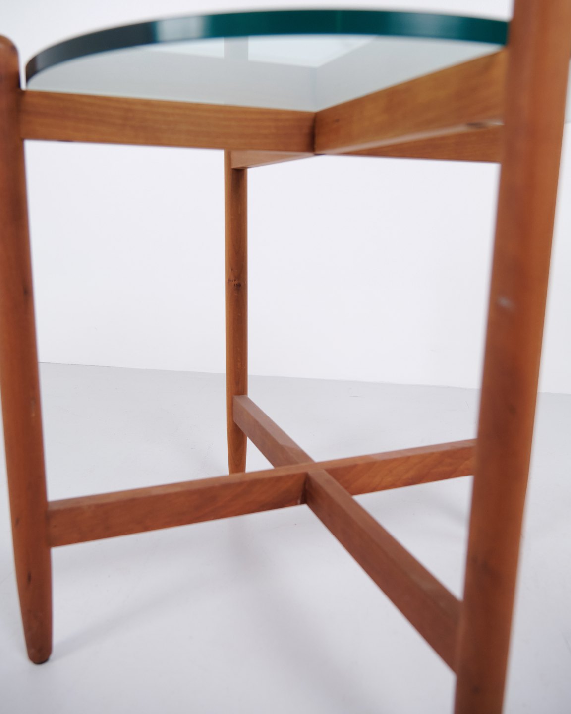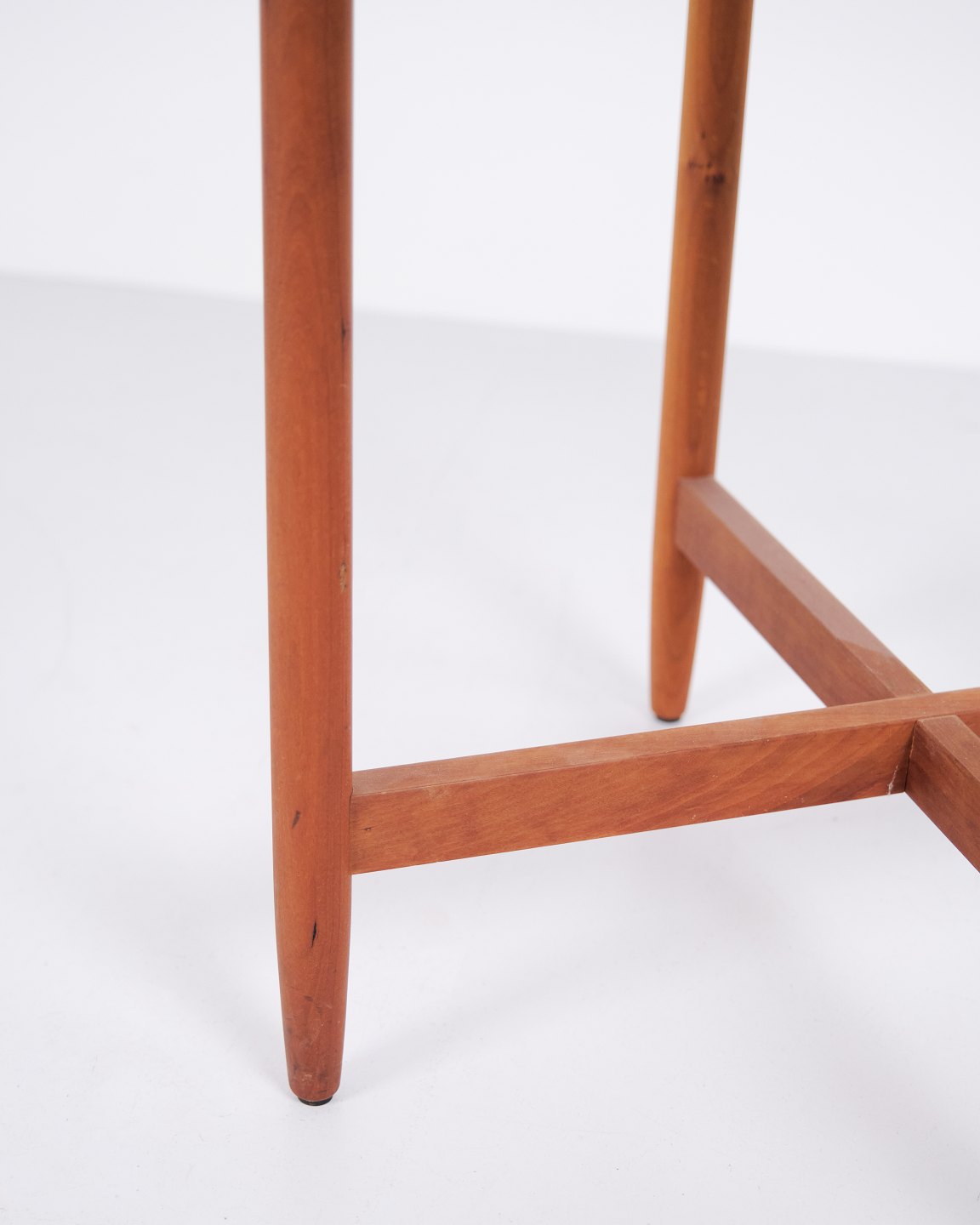 Beskrivelse: Svensk sidebord fra 1960’erne udført i kirsebær med rund glasplade. Bordet har organisk understel med blødt buede ben og gennemarbejdede samlinger, inspireret af formsproget fra Hans Johansson. Kombinationen af massivt træ og svævende glasplade er karakteristisk for skandinavisk design fra perioden. Velegnet som lampebord, sofabord eller mindre sidebord.