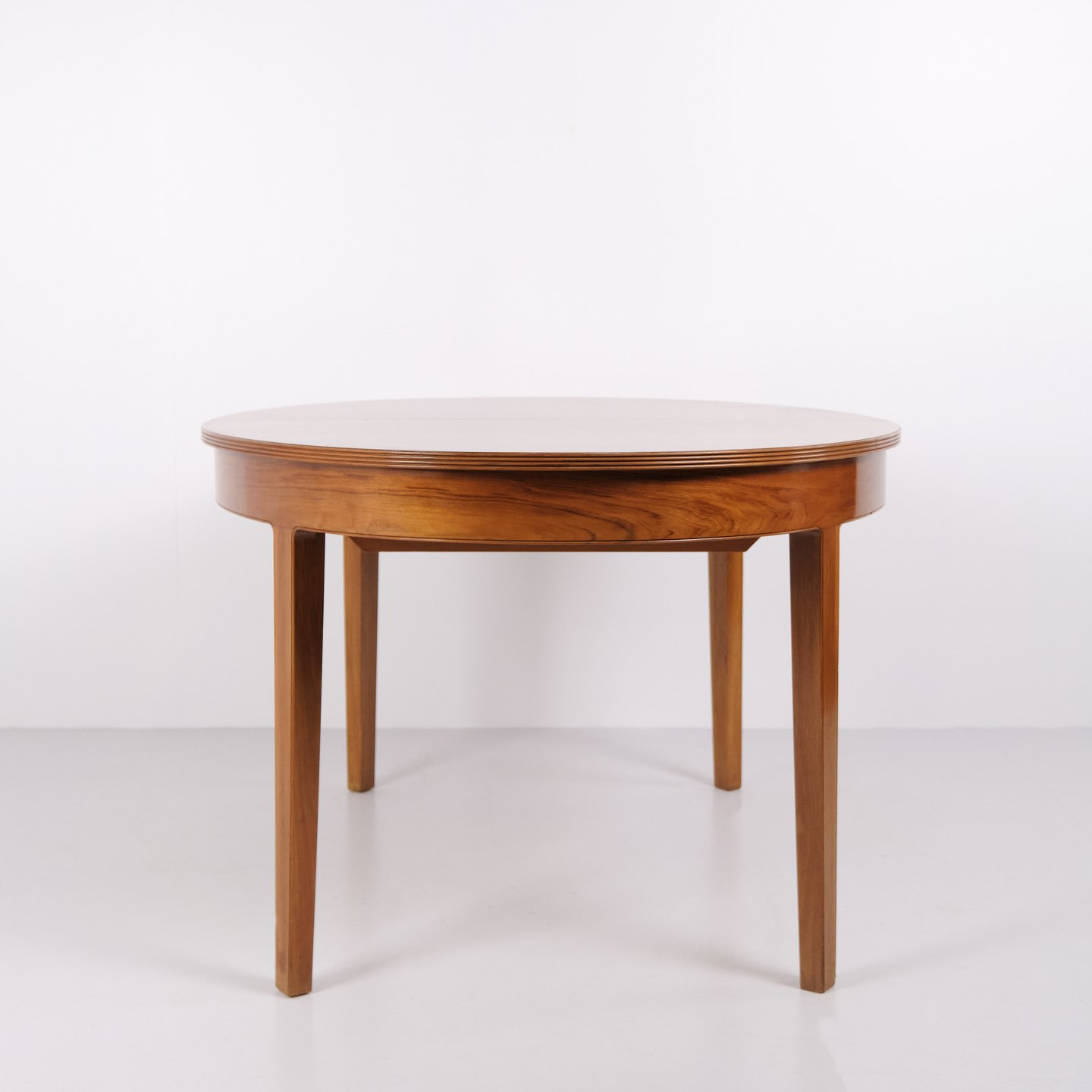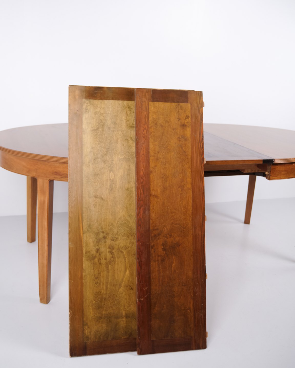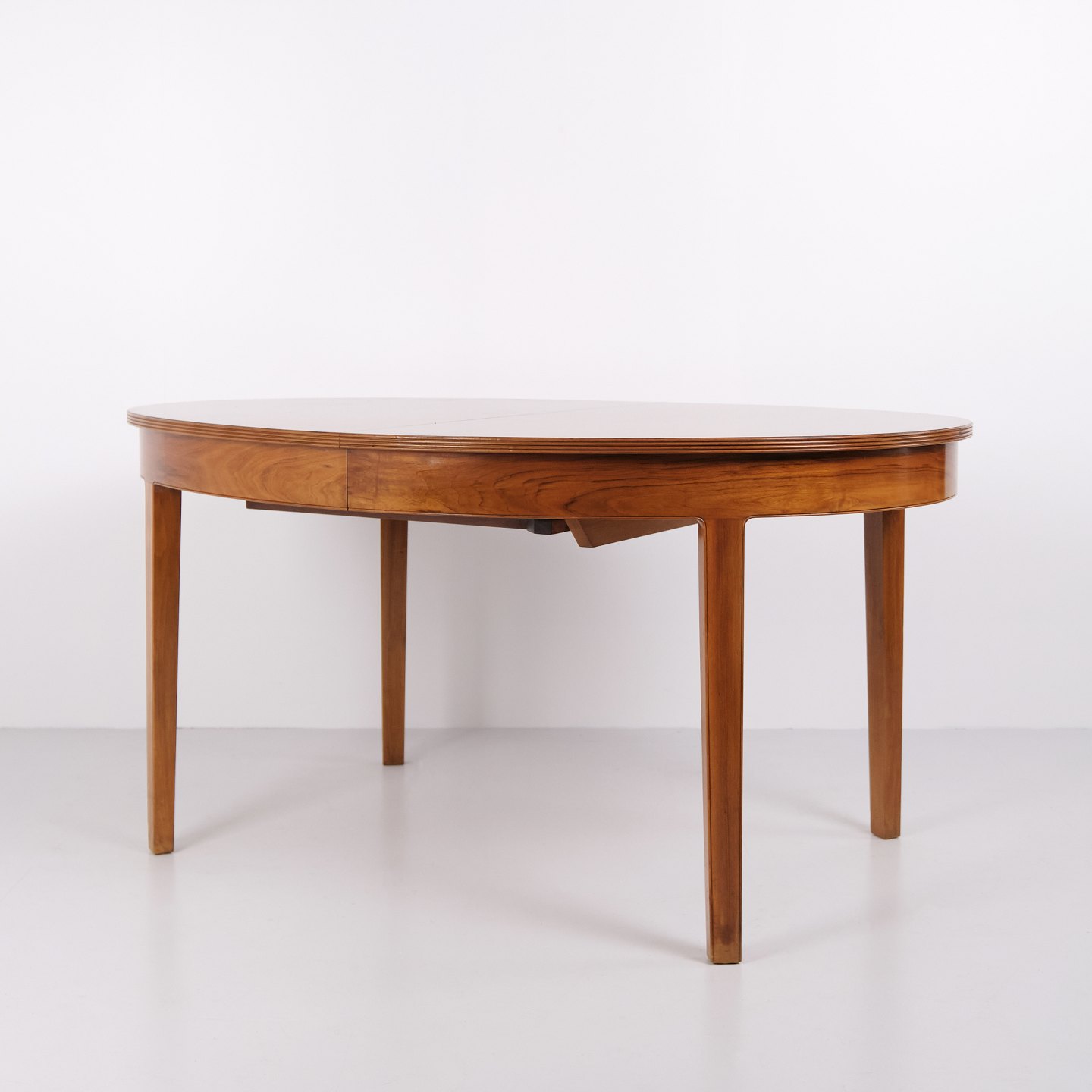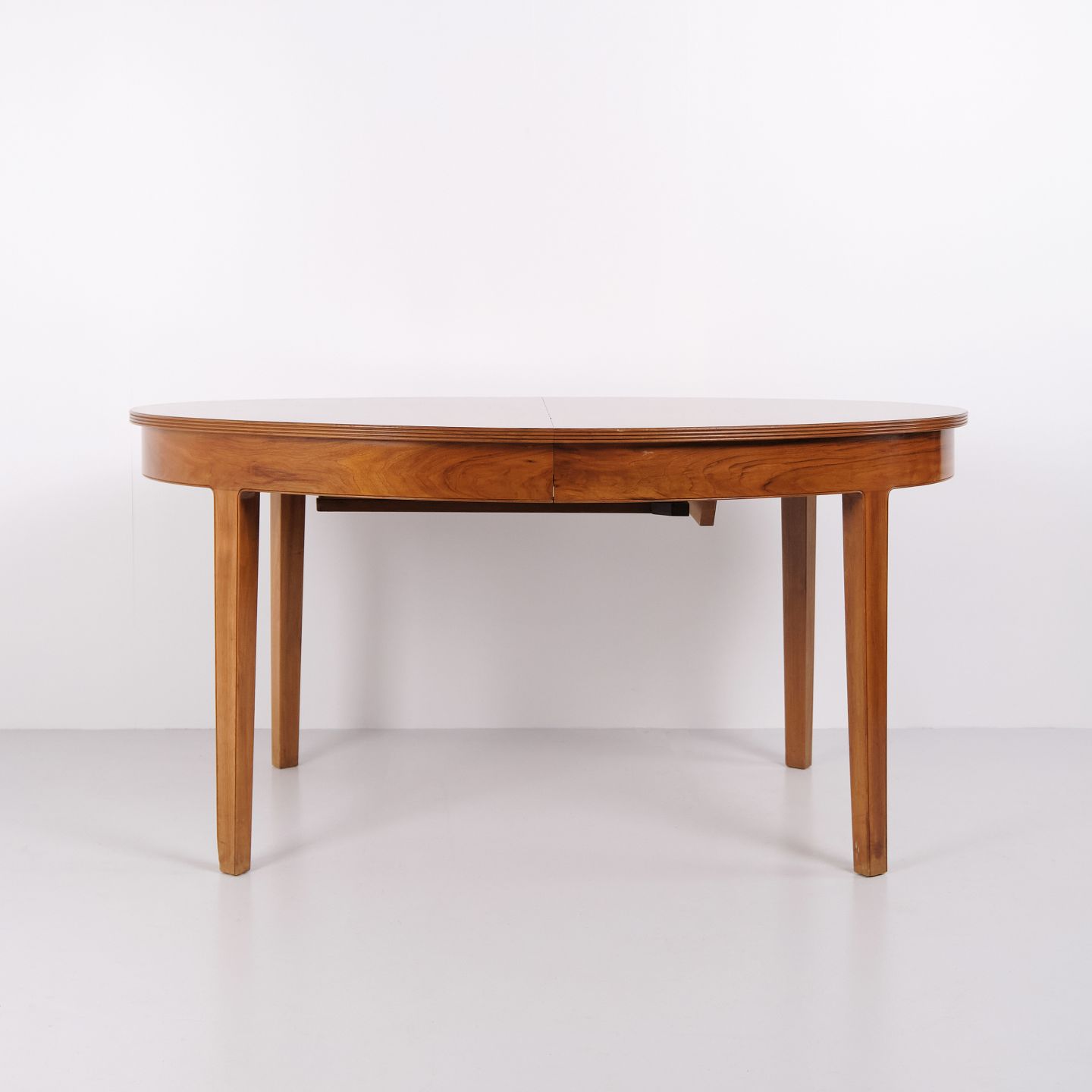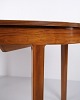 Beskrivelse: Ovalt spisebord fremstillet i dansk design i 1960’erne. Udført i palisander med markant åretegning. Bordet har udtræk med fire tillægsplader bestående af tre plader á 55 cm og én plade á 30 cm. Total længde fuldt udslået er 345 cm. Velegnet som spisebord, mødebord eller langbord.