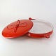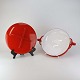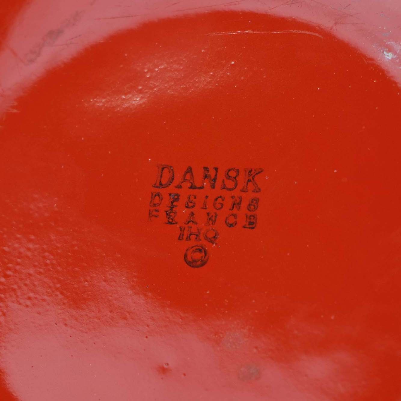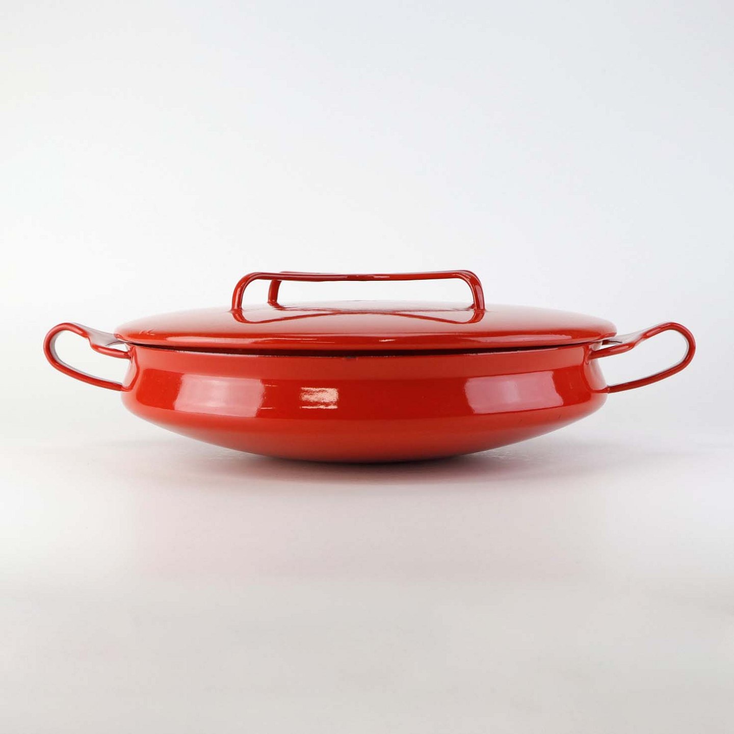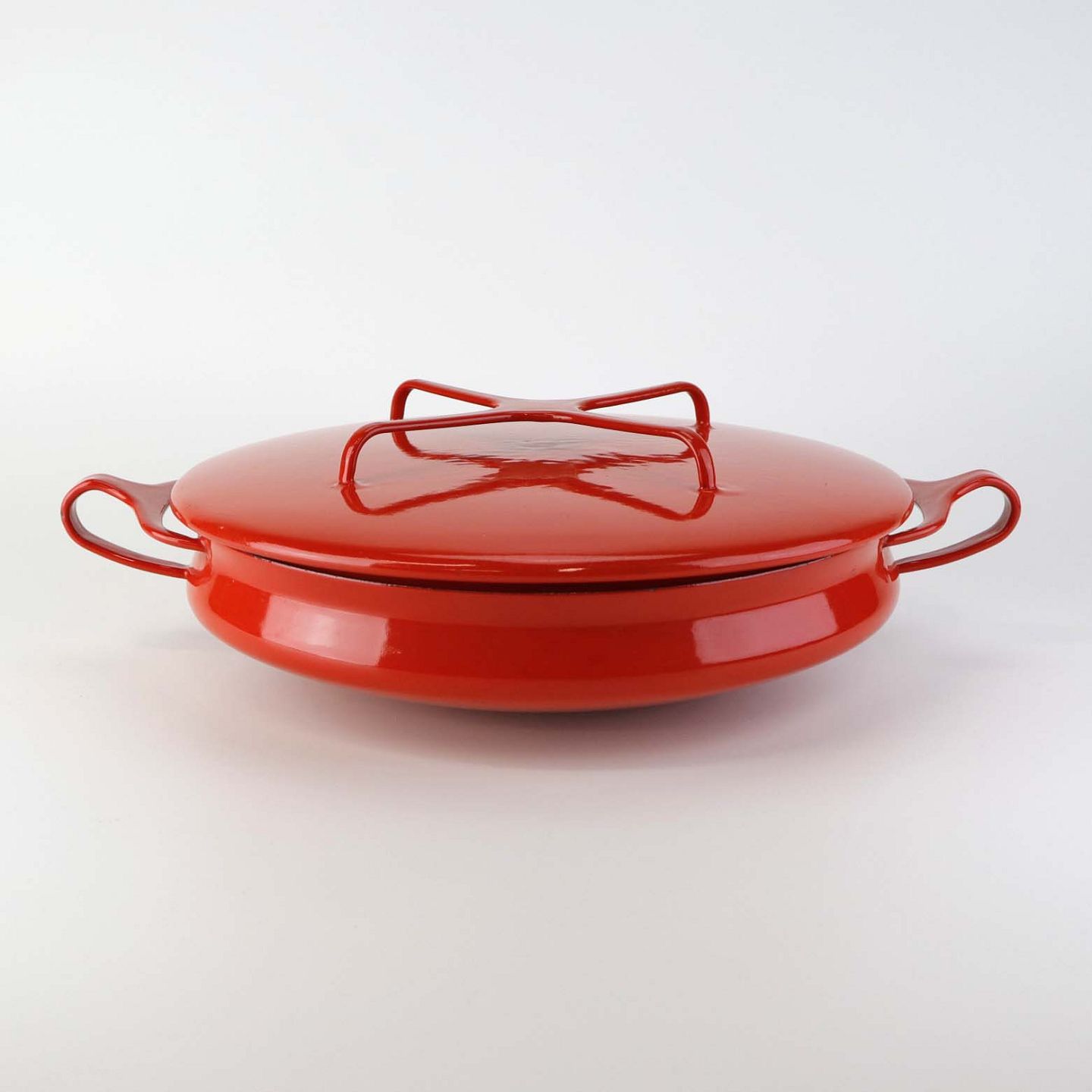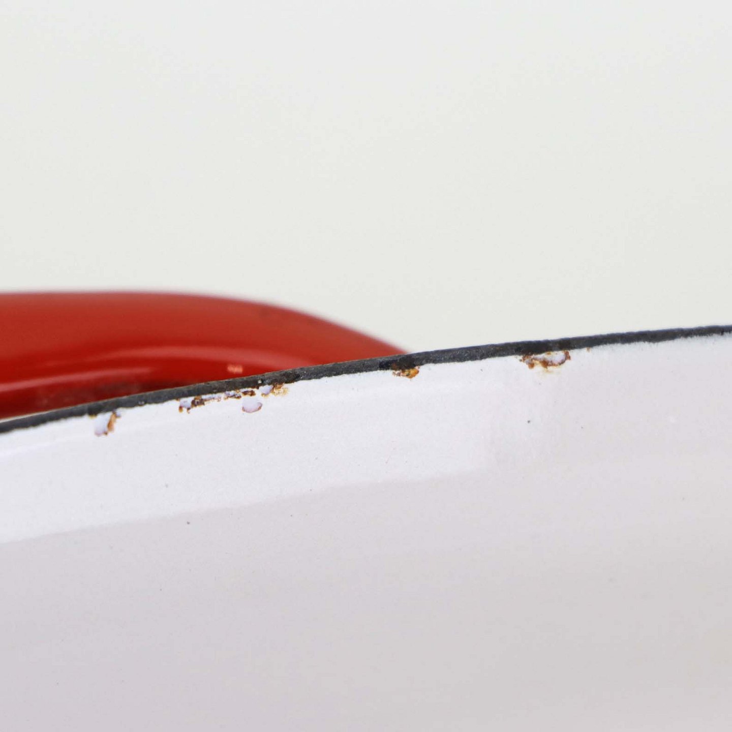 Beskrivelse: Kasserolle med låg fra serien Kobenstyle fremstillet i metal og belagt i rød og hvid emalje. Model France