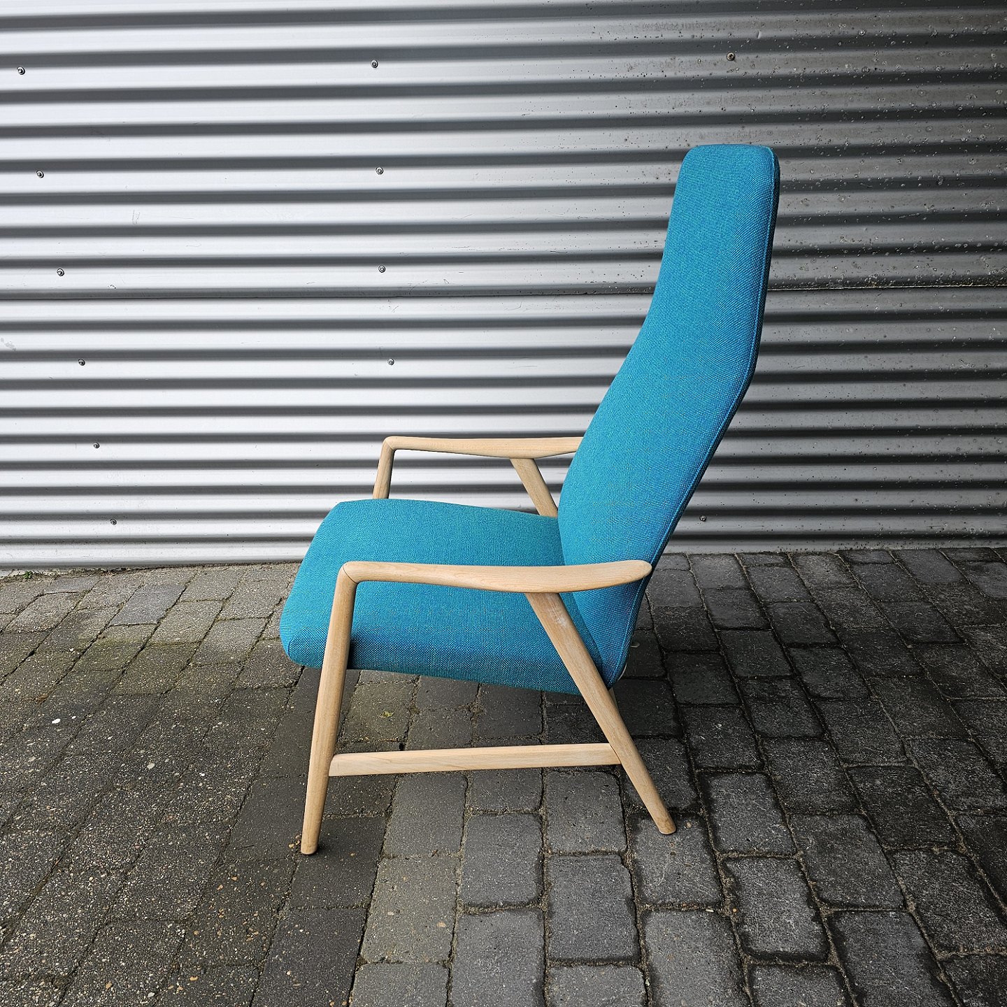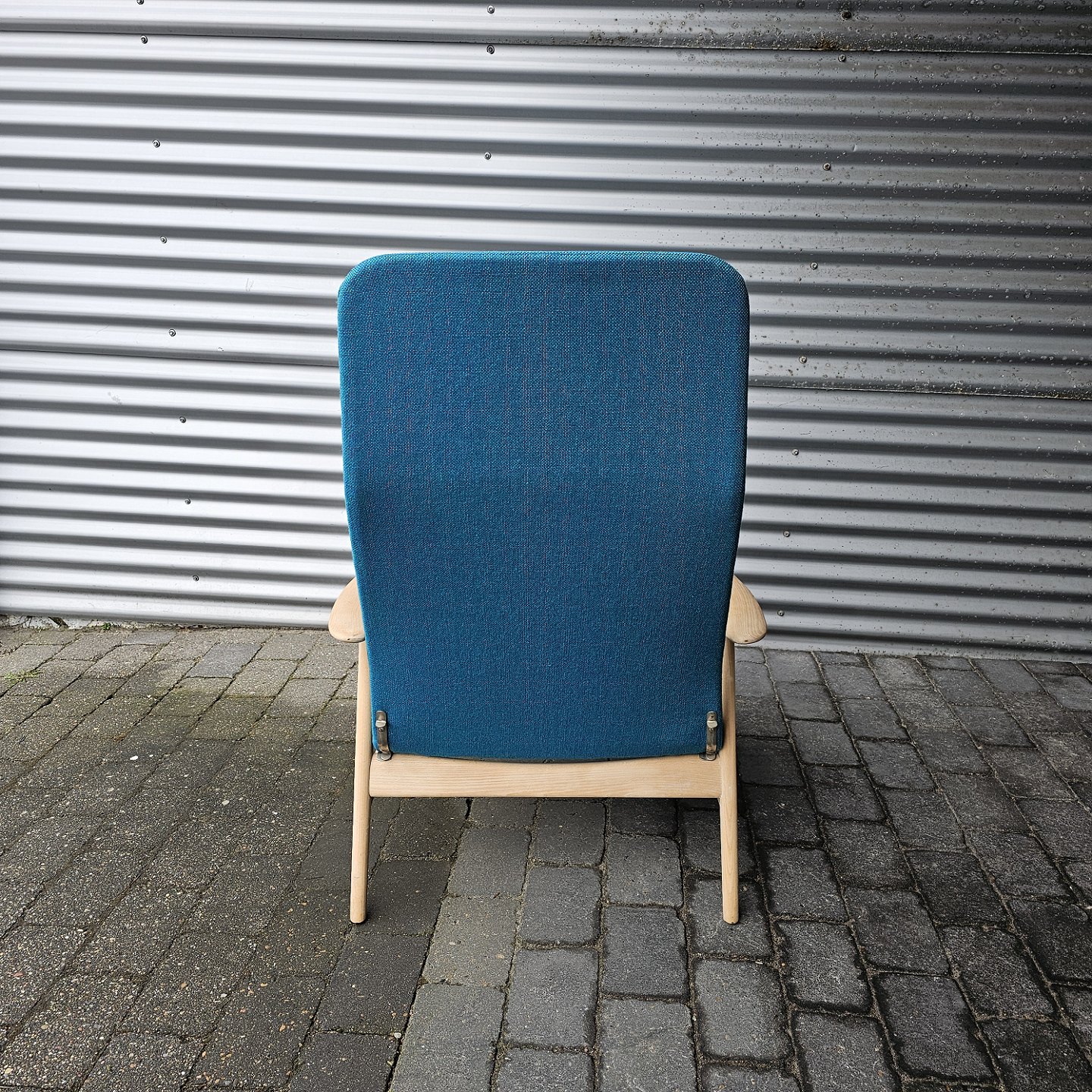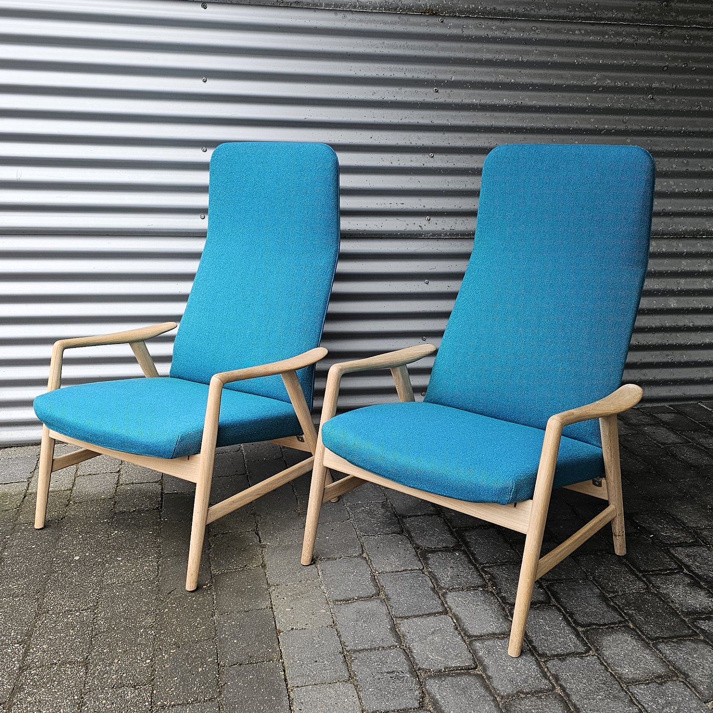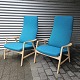 Beskrivelse: Sæt af to lænestole med træstel og sæde betrukket i blå Hallingdal uld