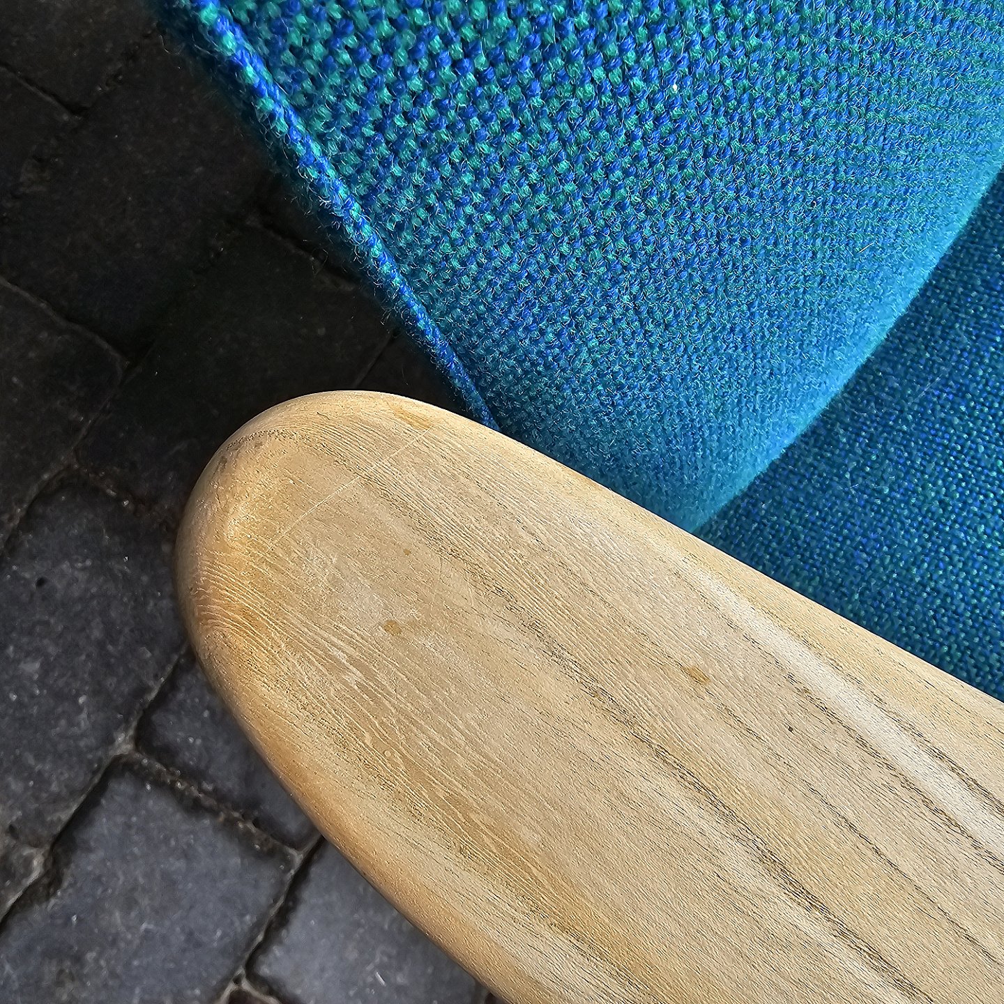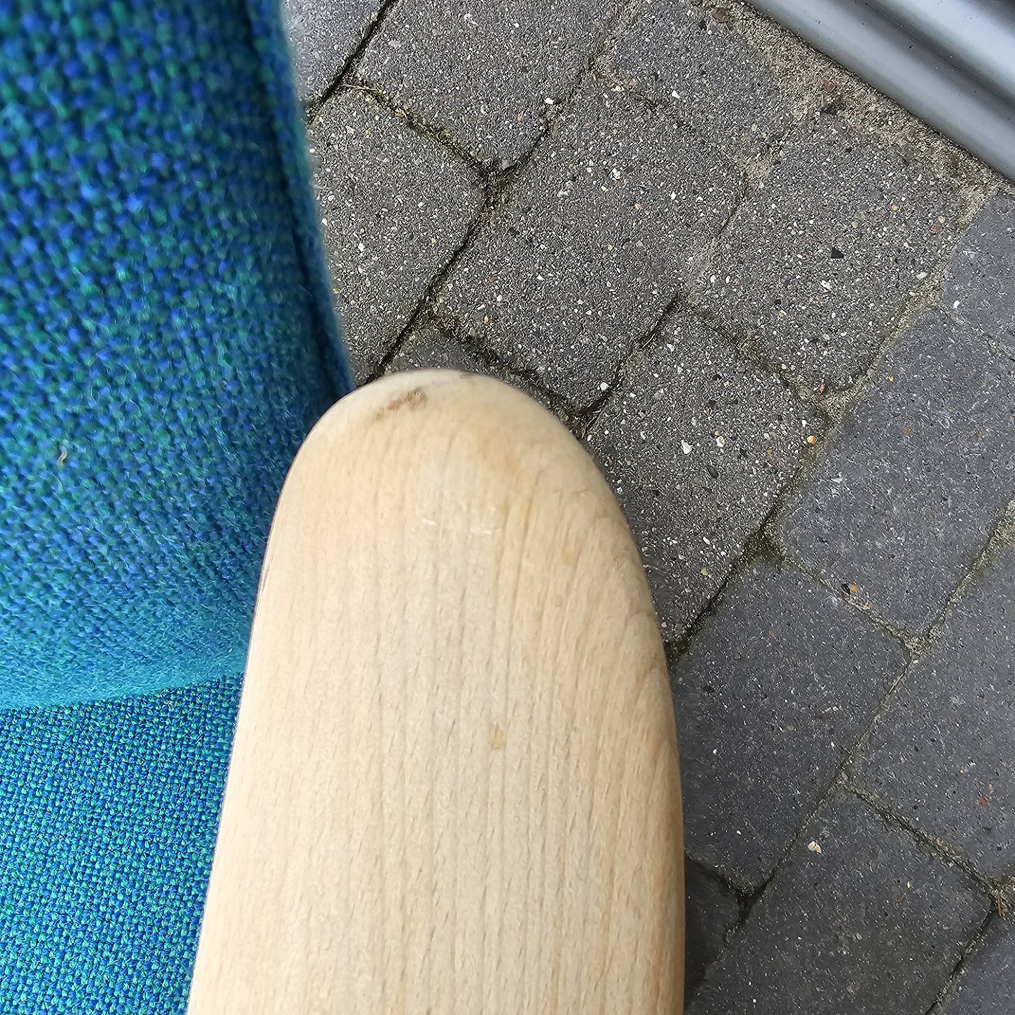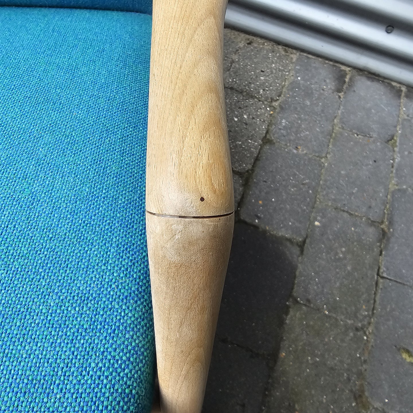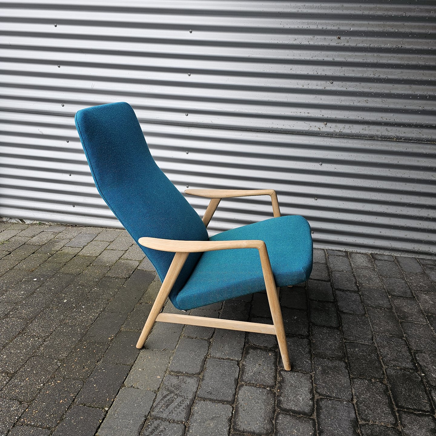 Beskrivelse: Sæt af to lænestole med træstel og sæde betrukket i blå Hallingdal uld