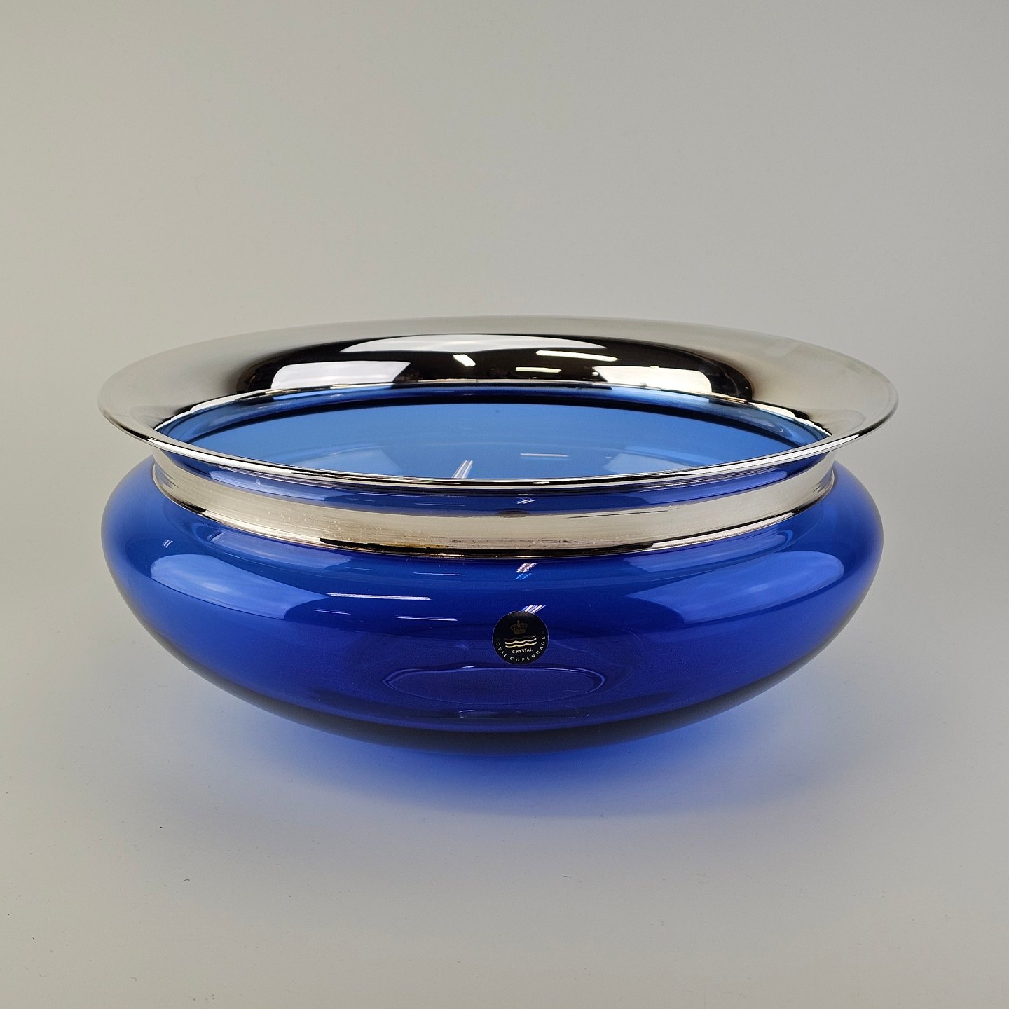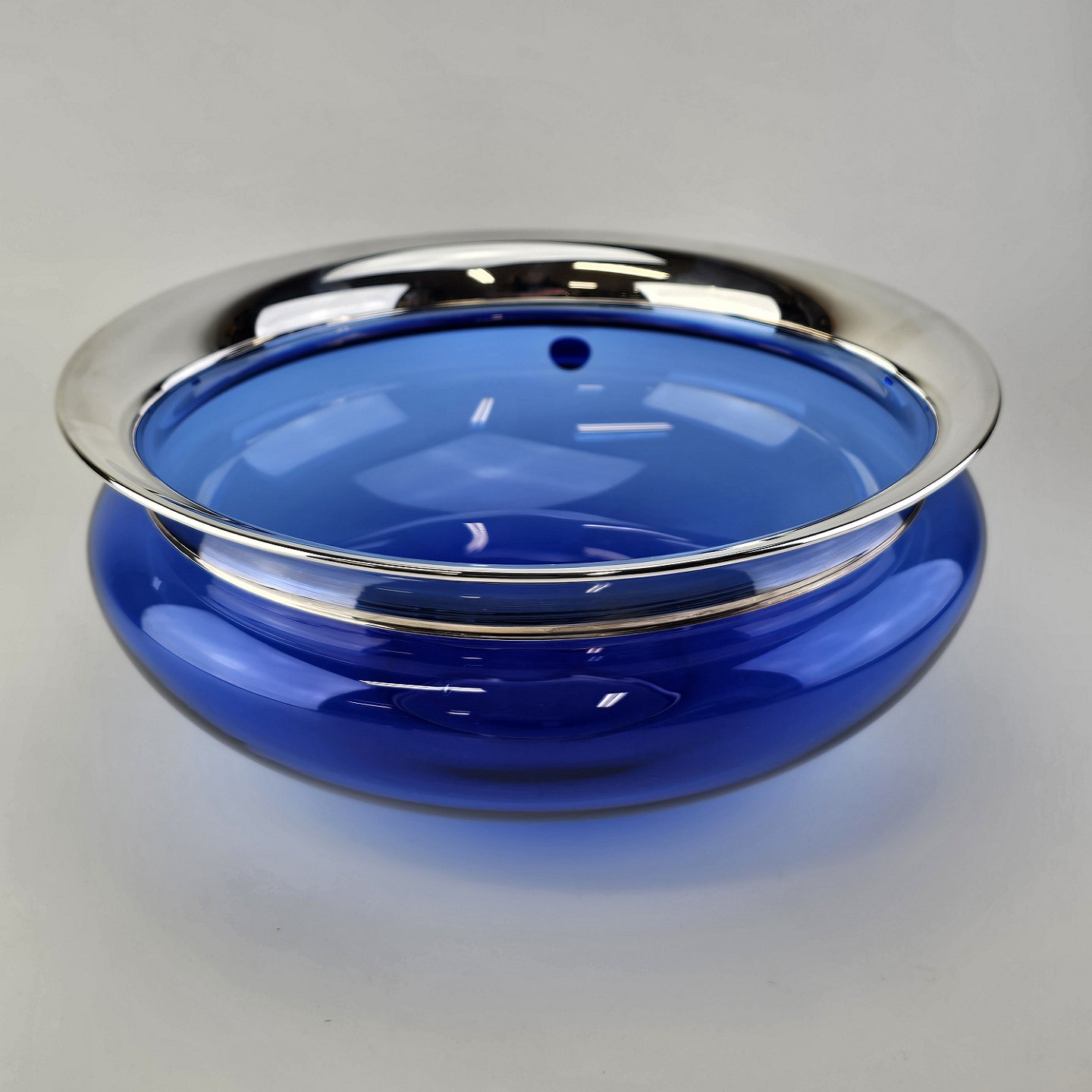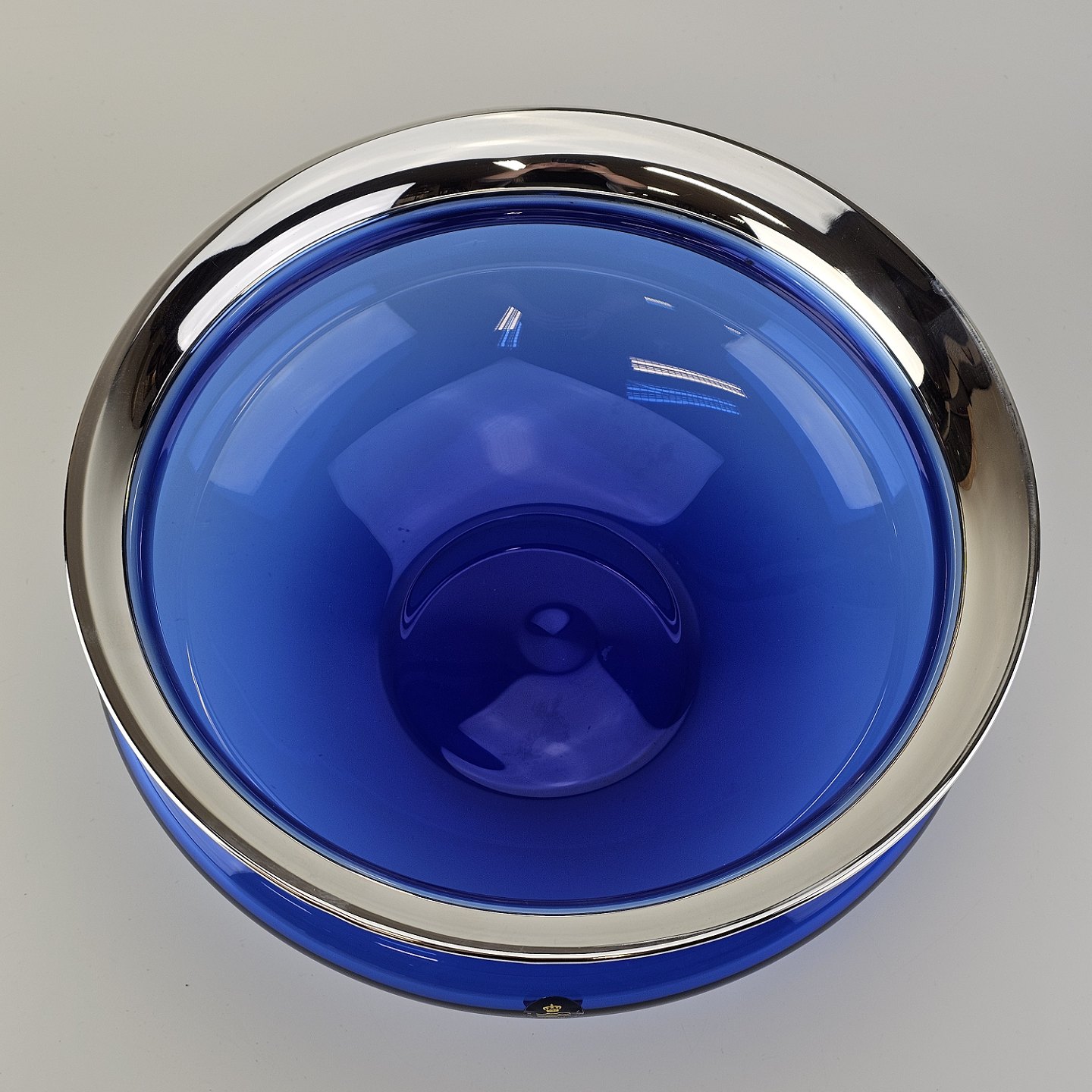 Beskrivelse: Mundblæst skål i blåt krystalglas med kant dyppet i sølv, fra serien Saturn