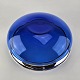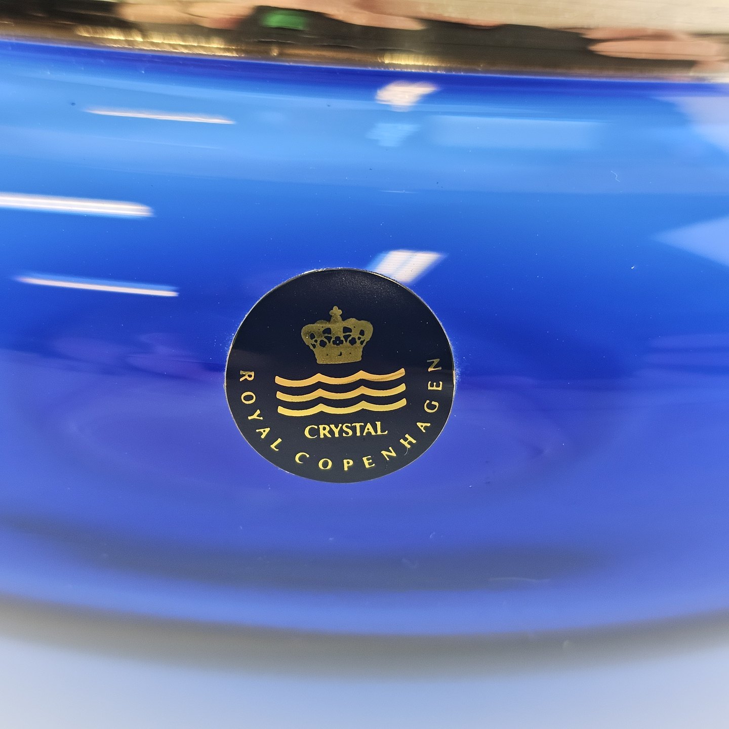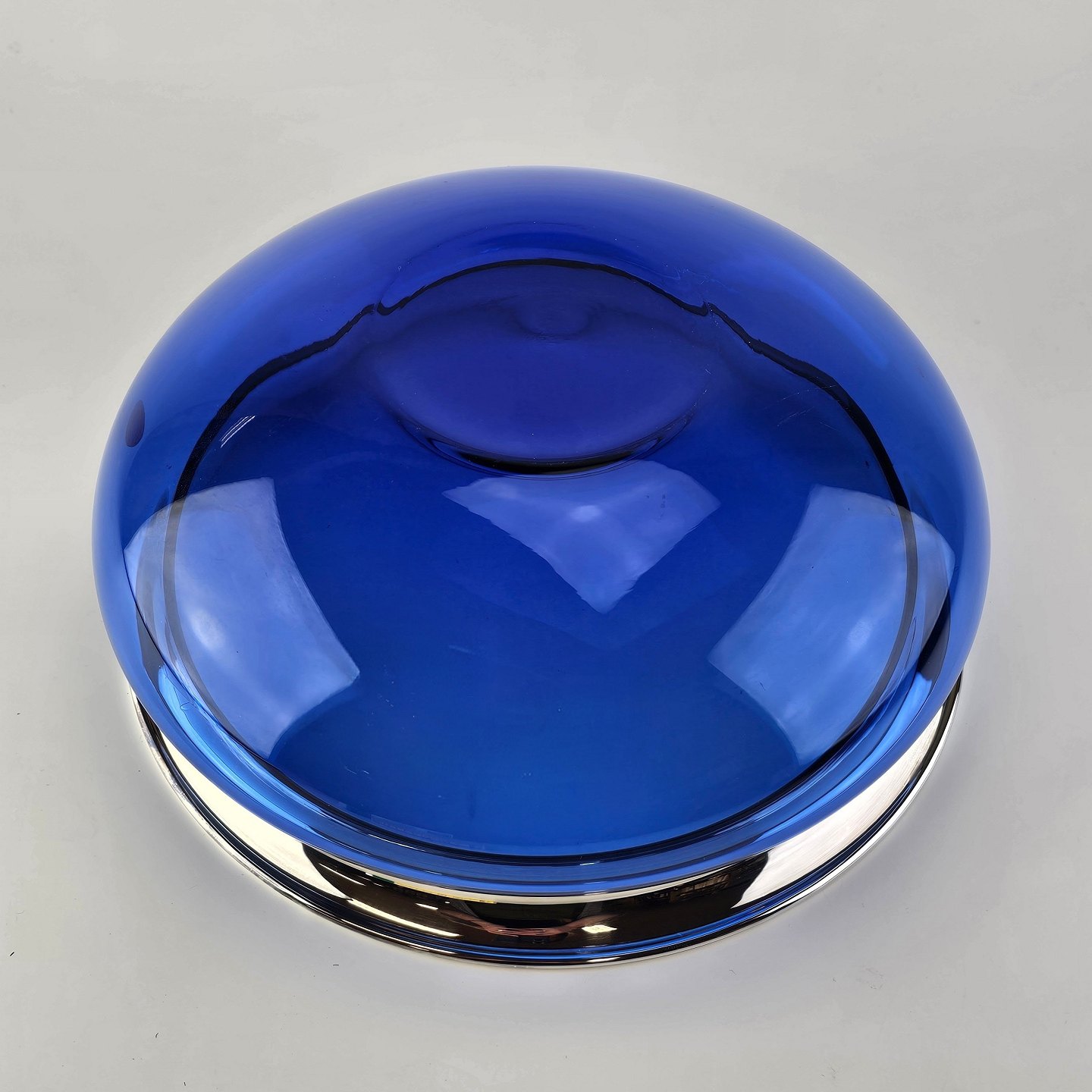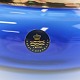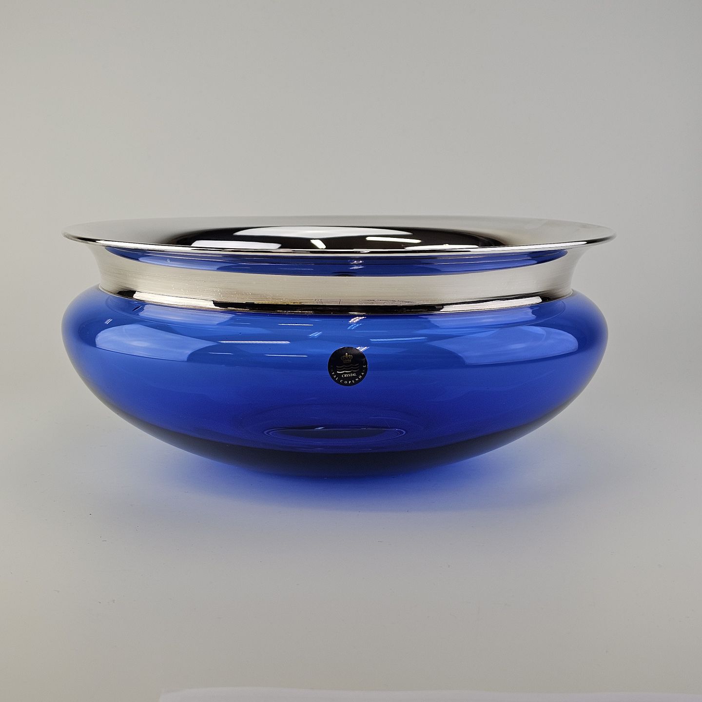 Beskrivelse: Mundblæst skål i blåt krystalglas med kant dyppet i sølv, fra serien Saturn