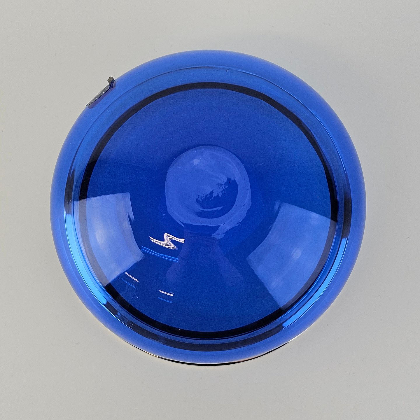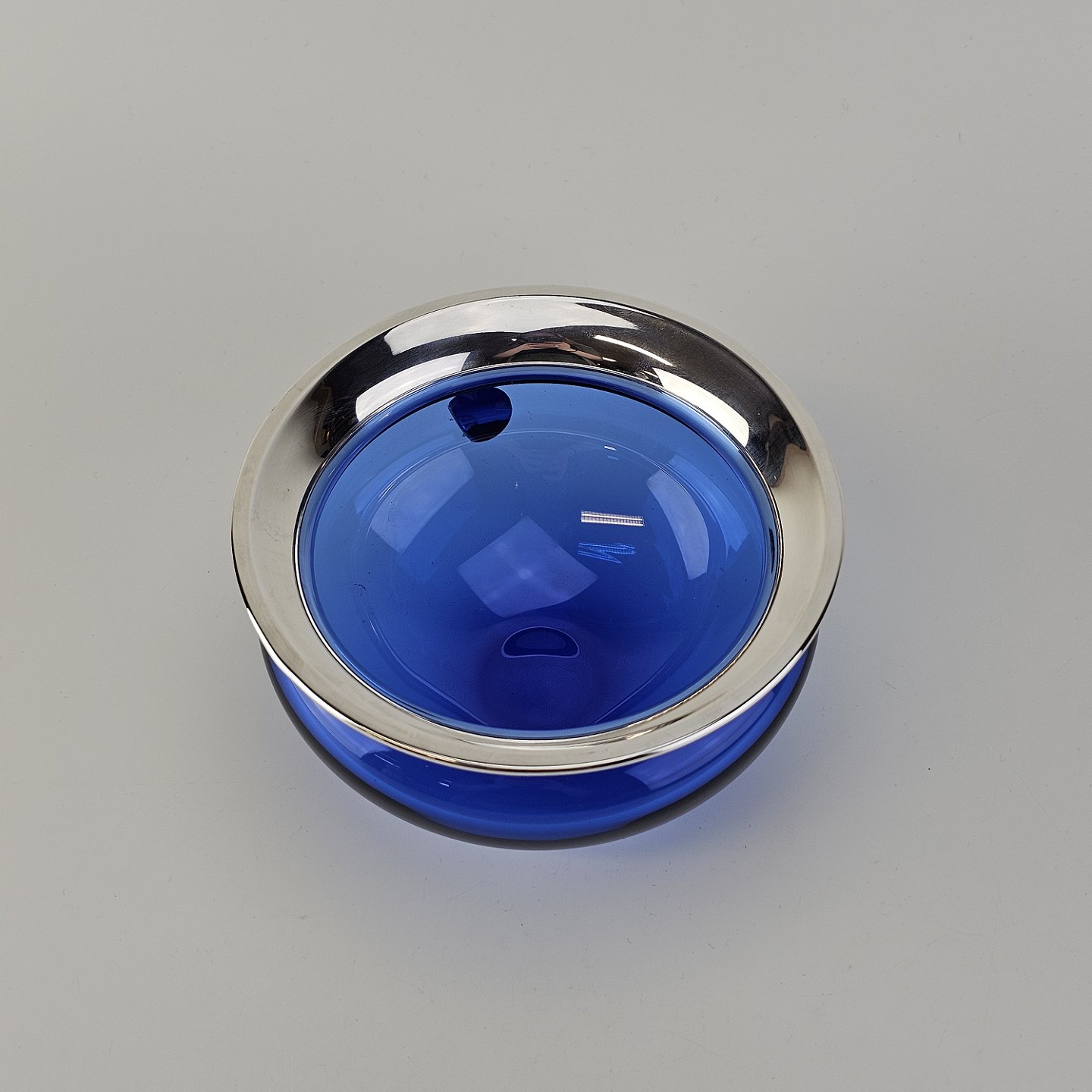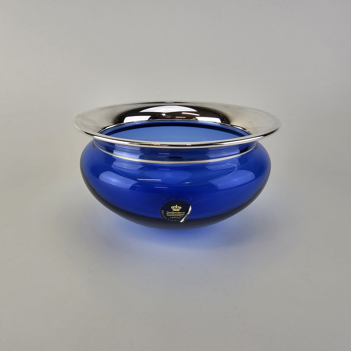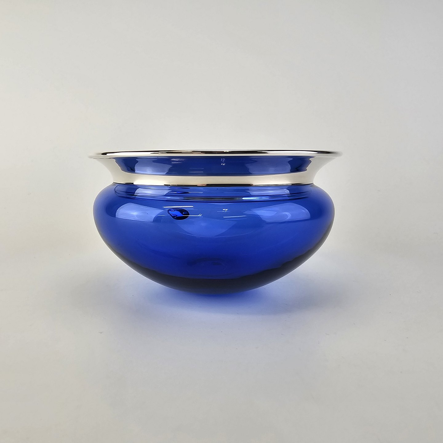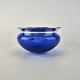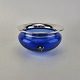 Beskrivelse: Mundblæst skål i blåt krystalglas med kant dyppet i sølv, fra serien Saturn