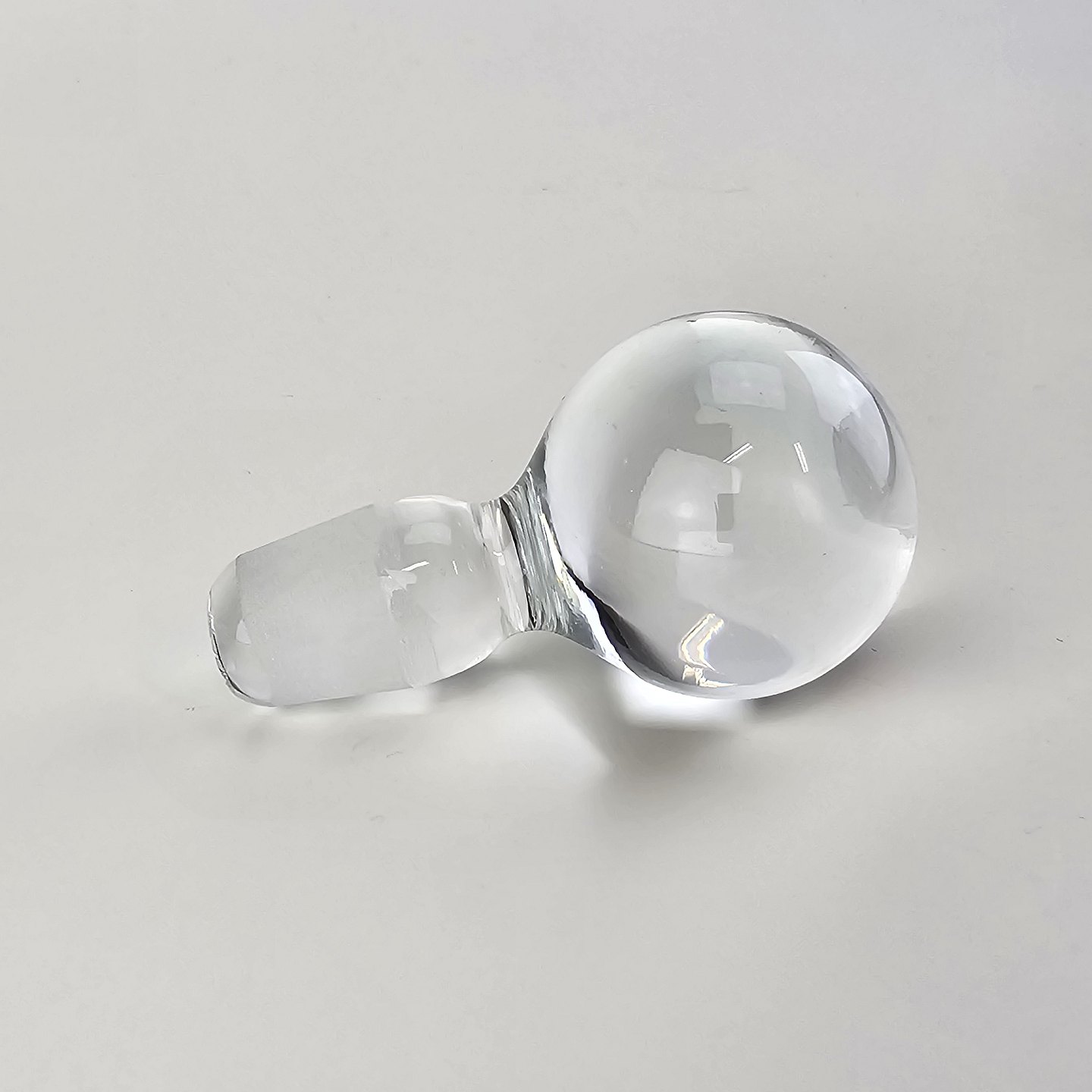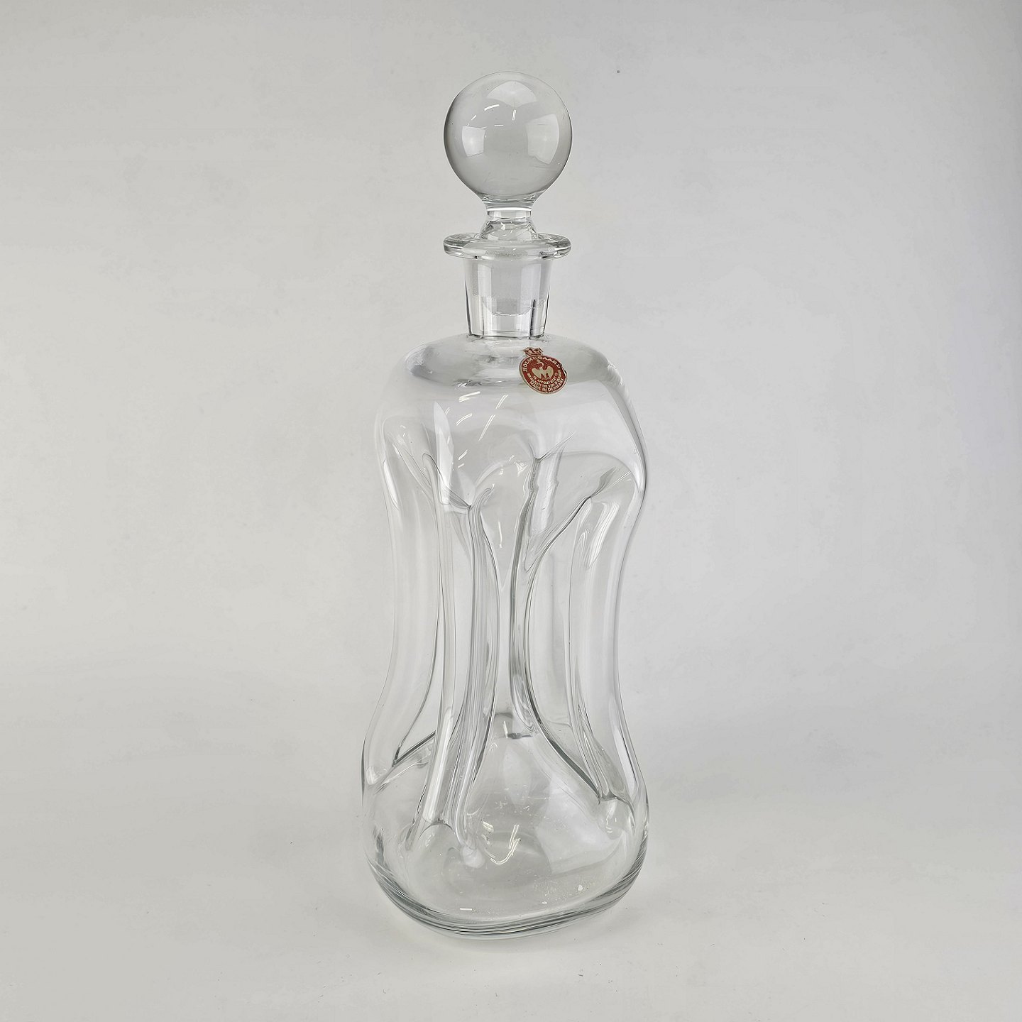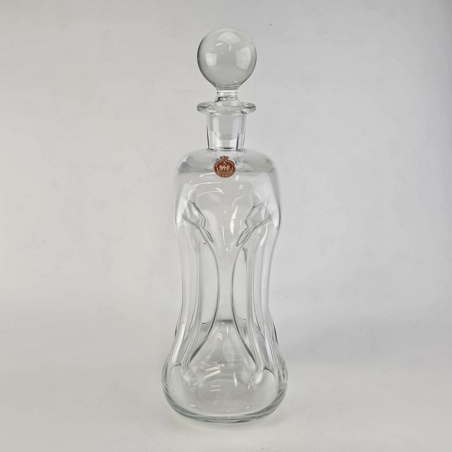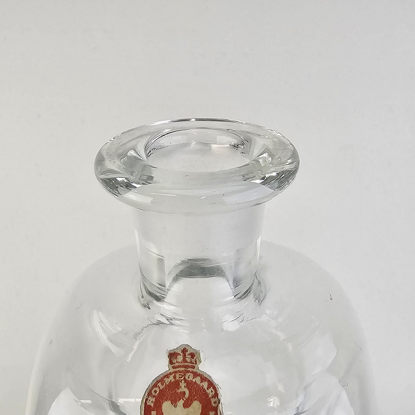 Beskrivelse: Klukflaske i klart glas med tilhørende prop med original mærke